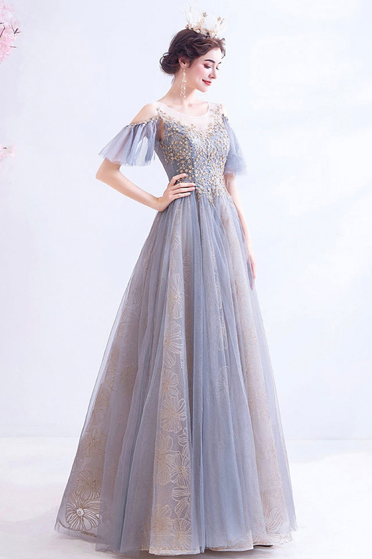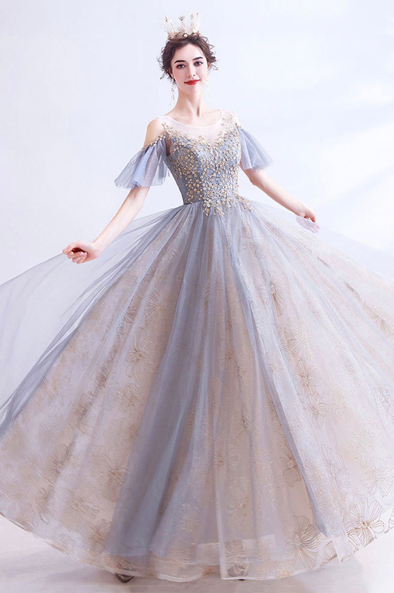 This dress is a dazzling work of art. Adorned with sequins, it shimmers with every step you take, creating a captivating display of light and beauty. The sequins catch the light, adding a touch of sparkle that's perfect for a night of celebration.