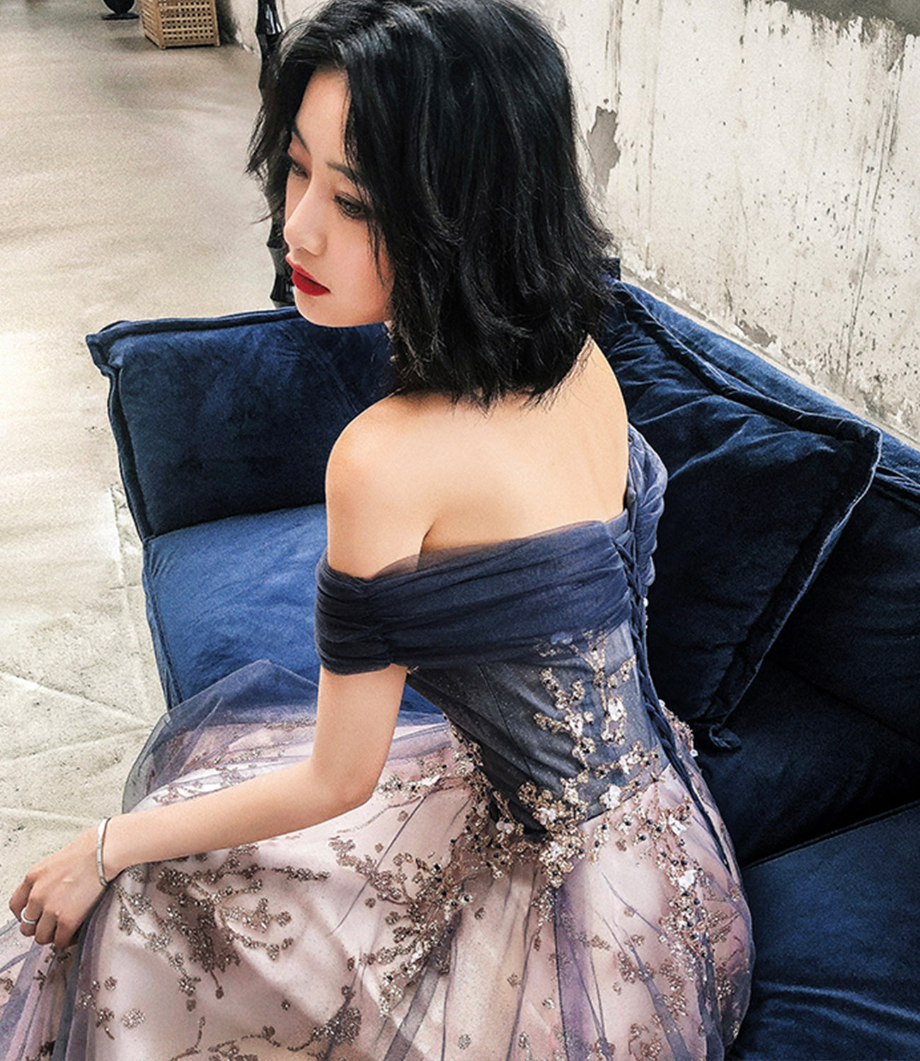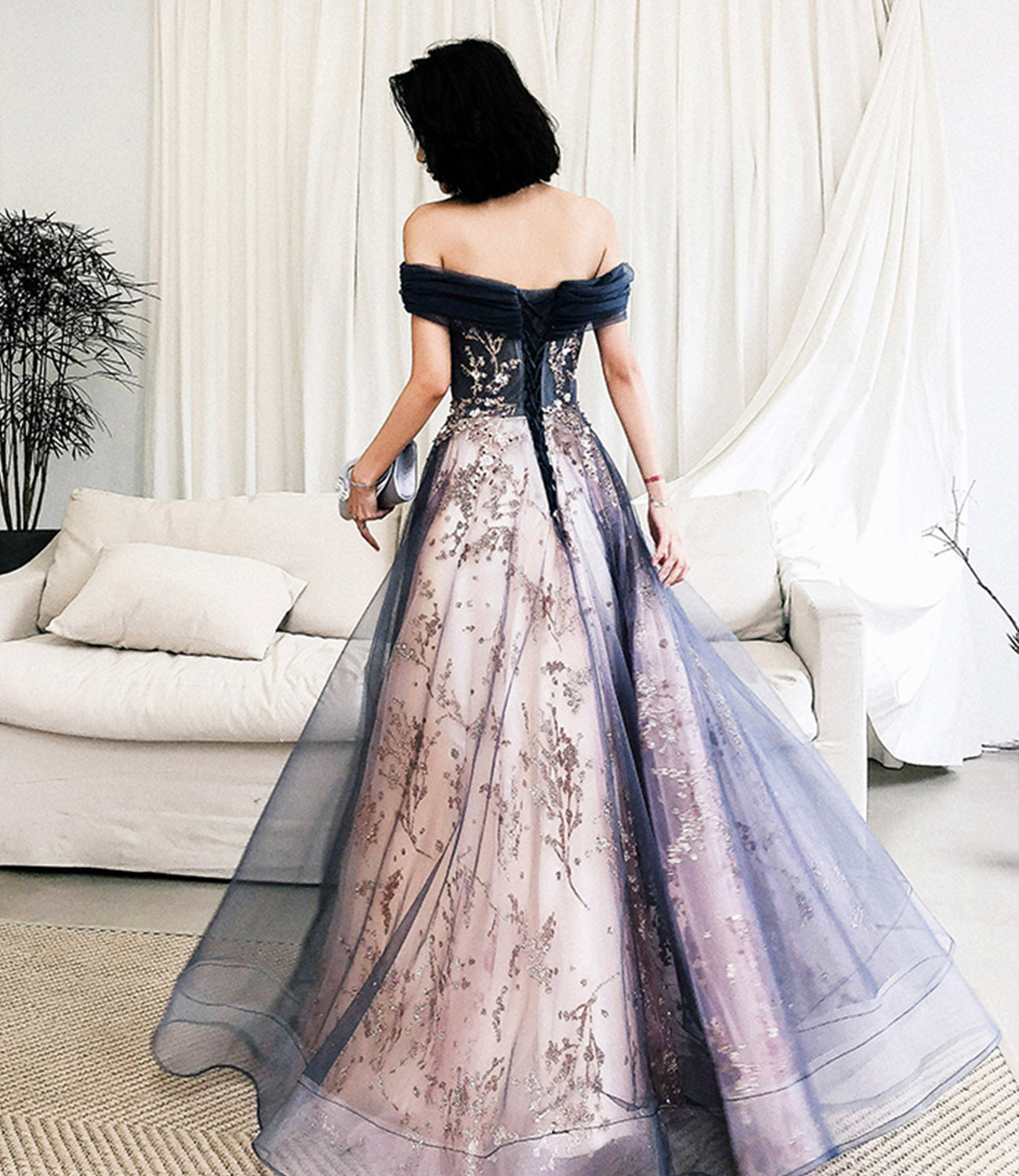 Blue tulle sequins long prom dress evening gown