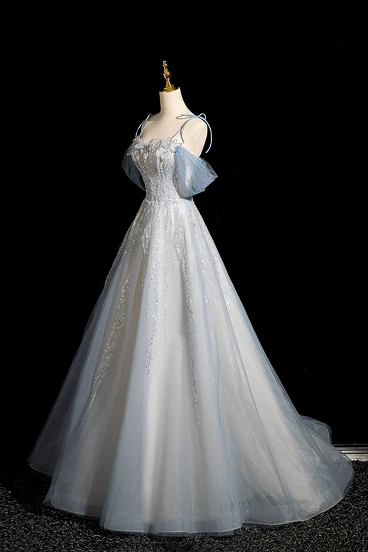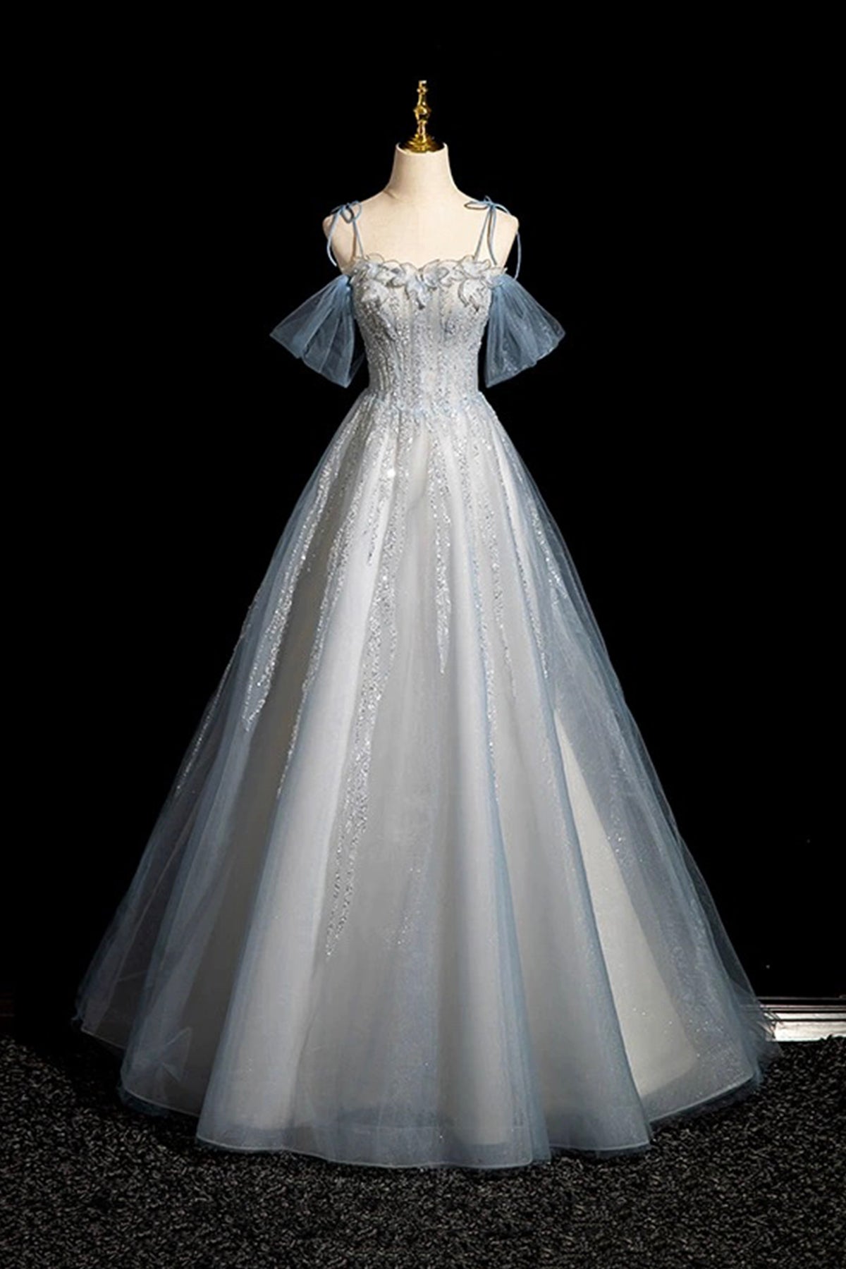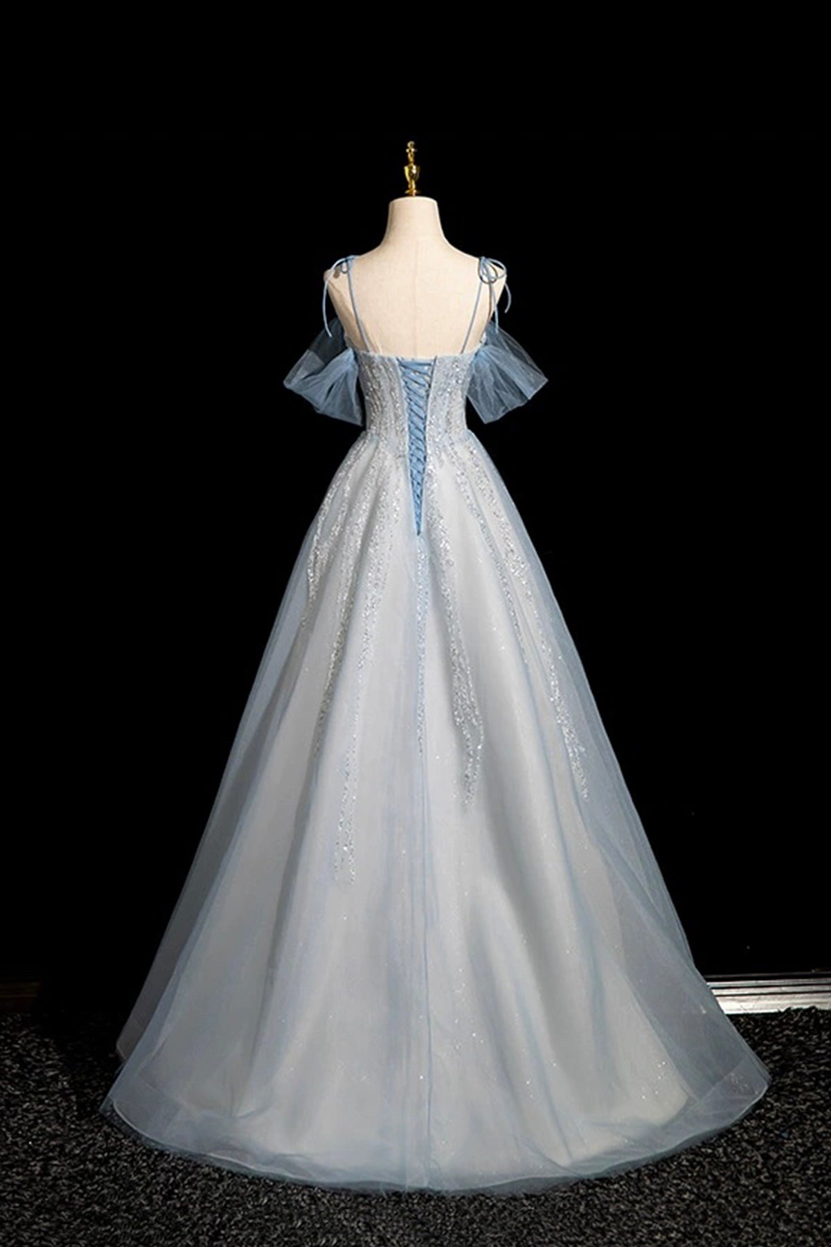 Blue Tulle Sequins Long Prom Dress, Shiny A-Line Party Dress
