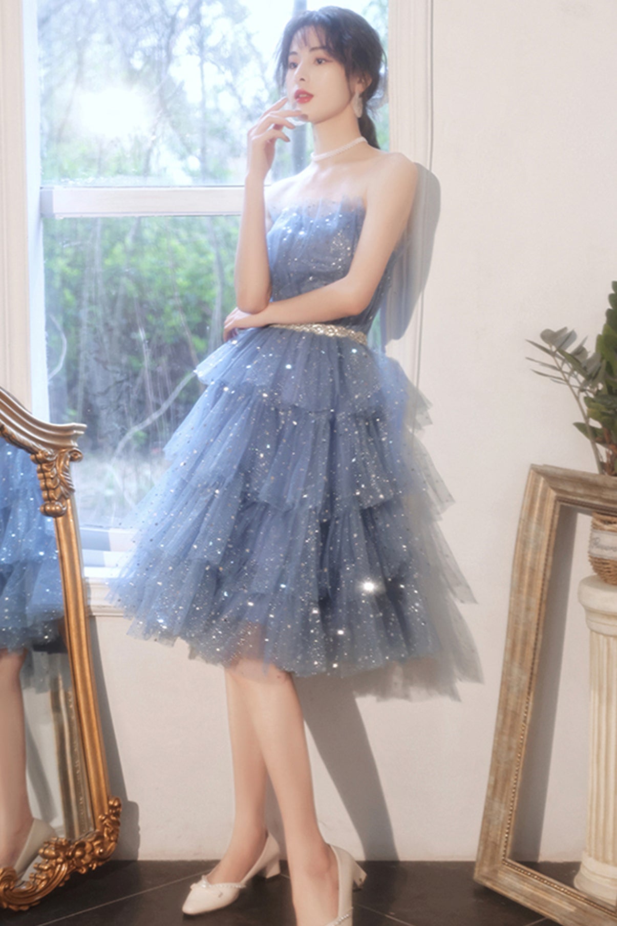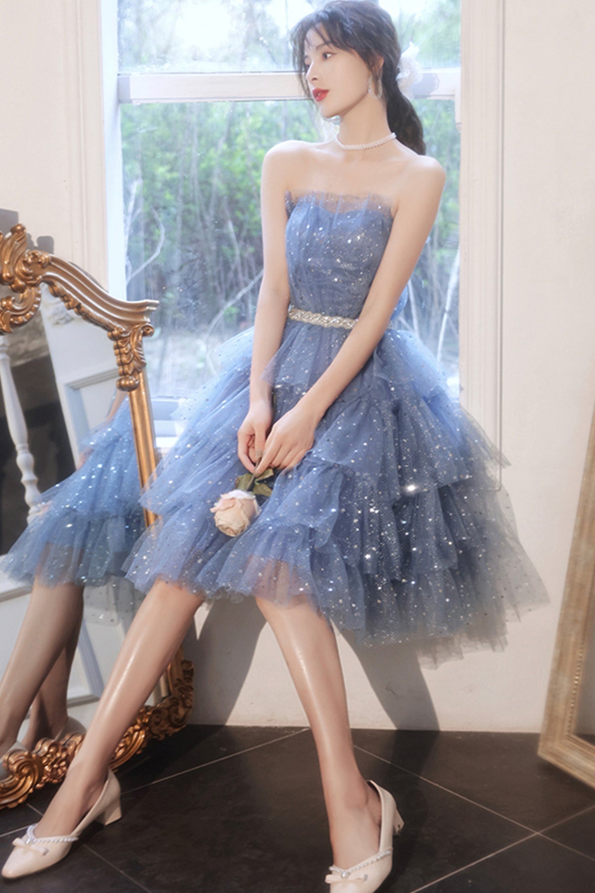 Blue tulle sequins short prom dress party dress