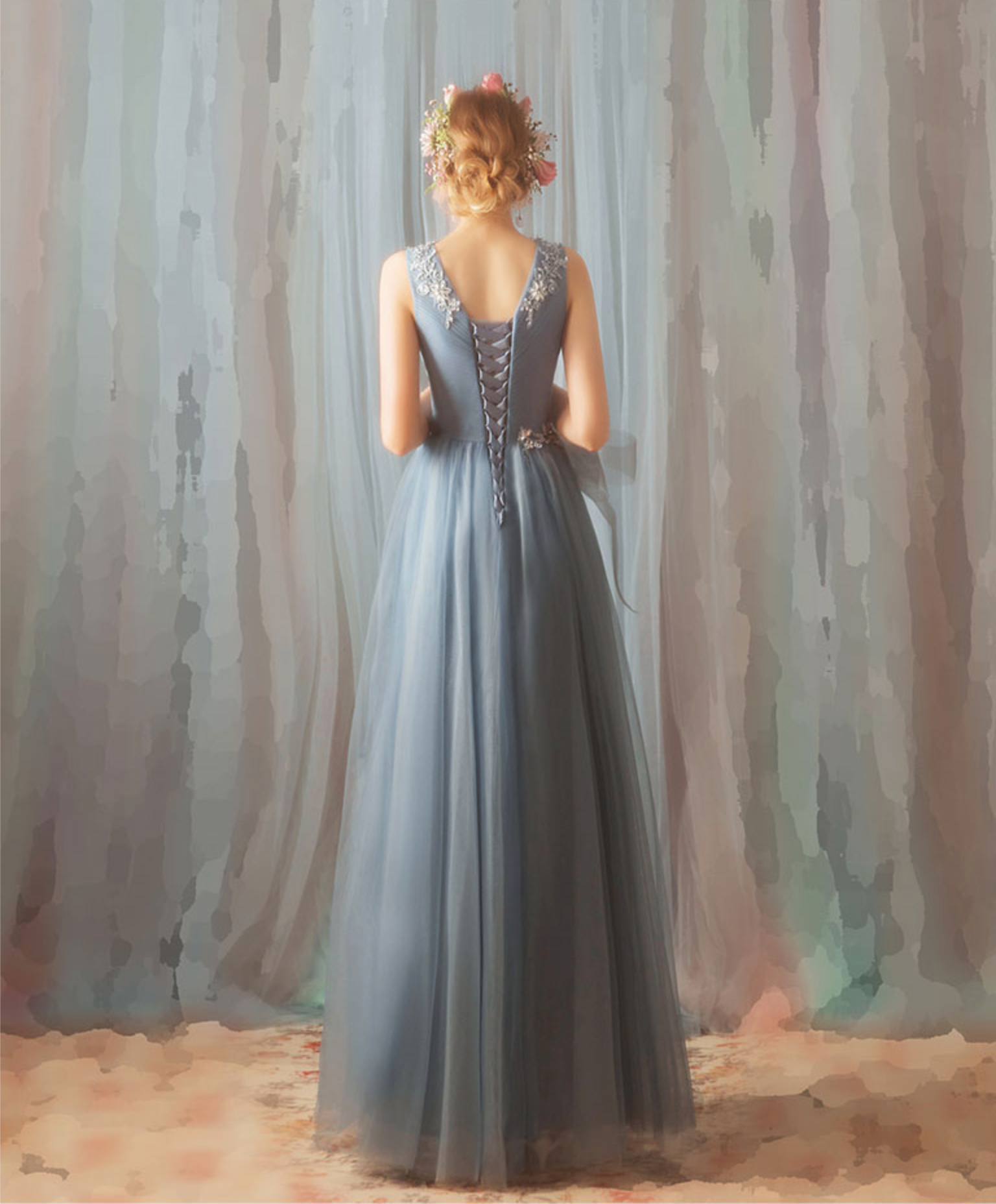 Blue v neck tulle lace long prom dress, blue evening dress 7848