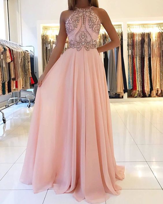 Blush Pink Halter Chiffon Open Back Long Prom Dress,Formal Gown With Beaded Top cg454