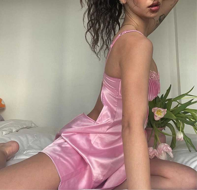 loveedsTM- pink satin slip dress women pinktuck details mini sexy women dress hollow out back chic ladies dress summer party