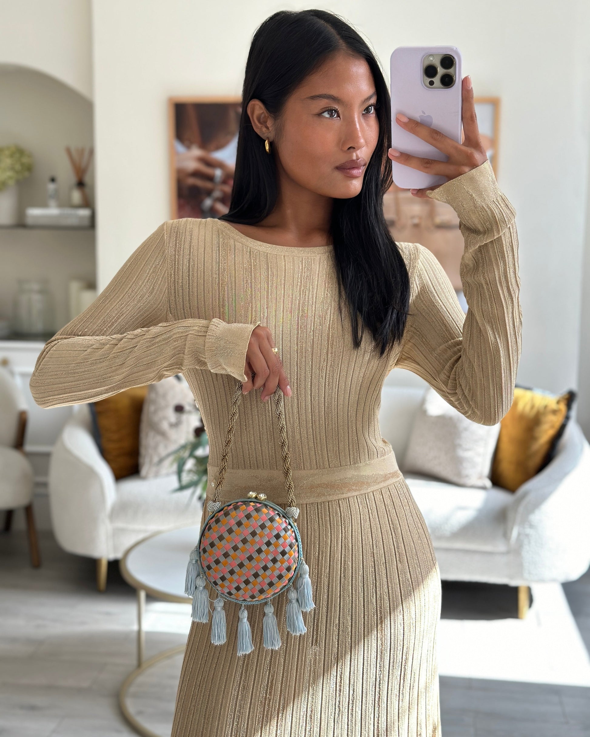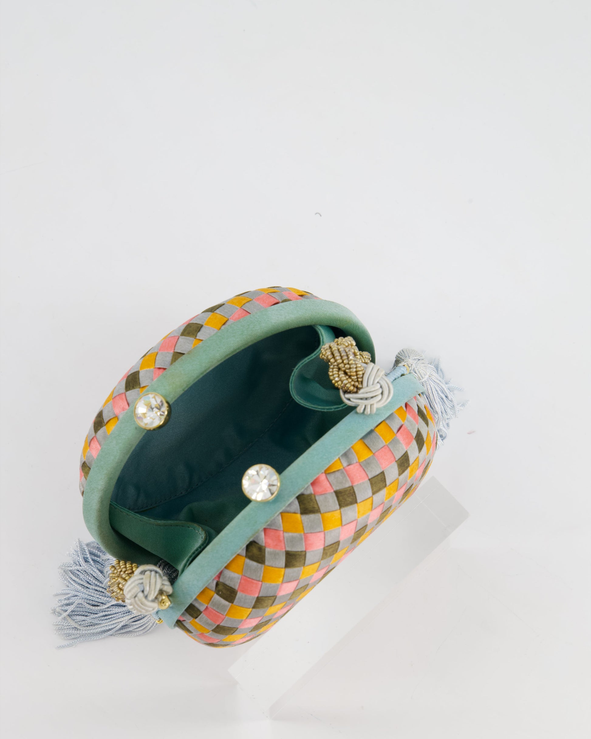 Bottega Veneta Blue and Orange Intrecciato Woven Circular Bag with Gold Strap and Blue Tassels