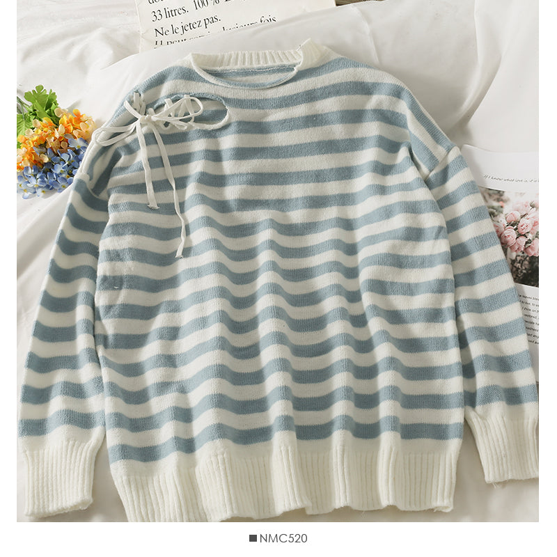 Bow tie tie stripe loose thin curled crew neck top 1941