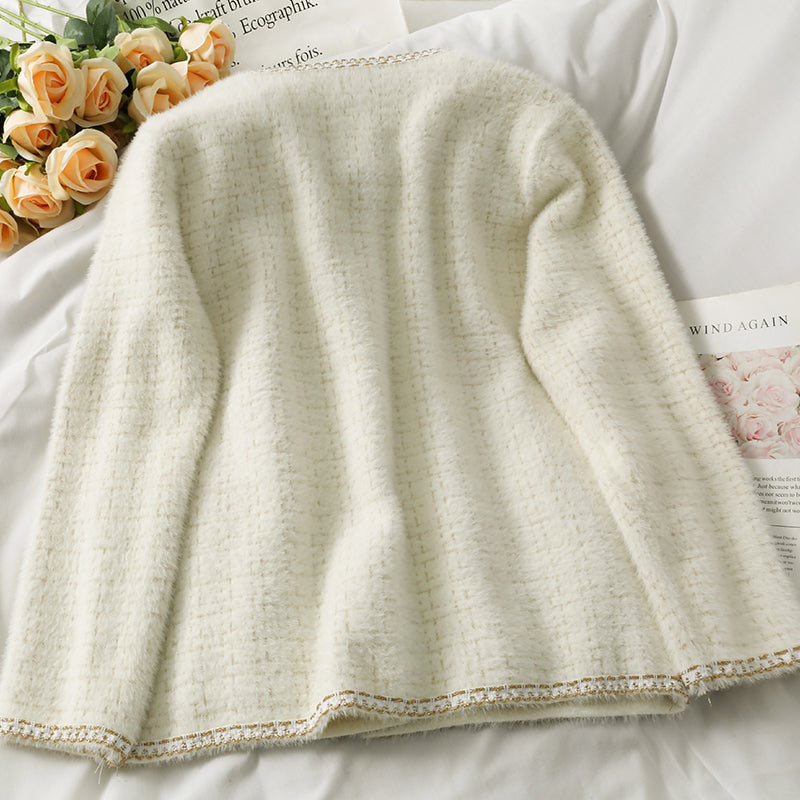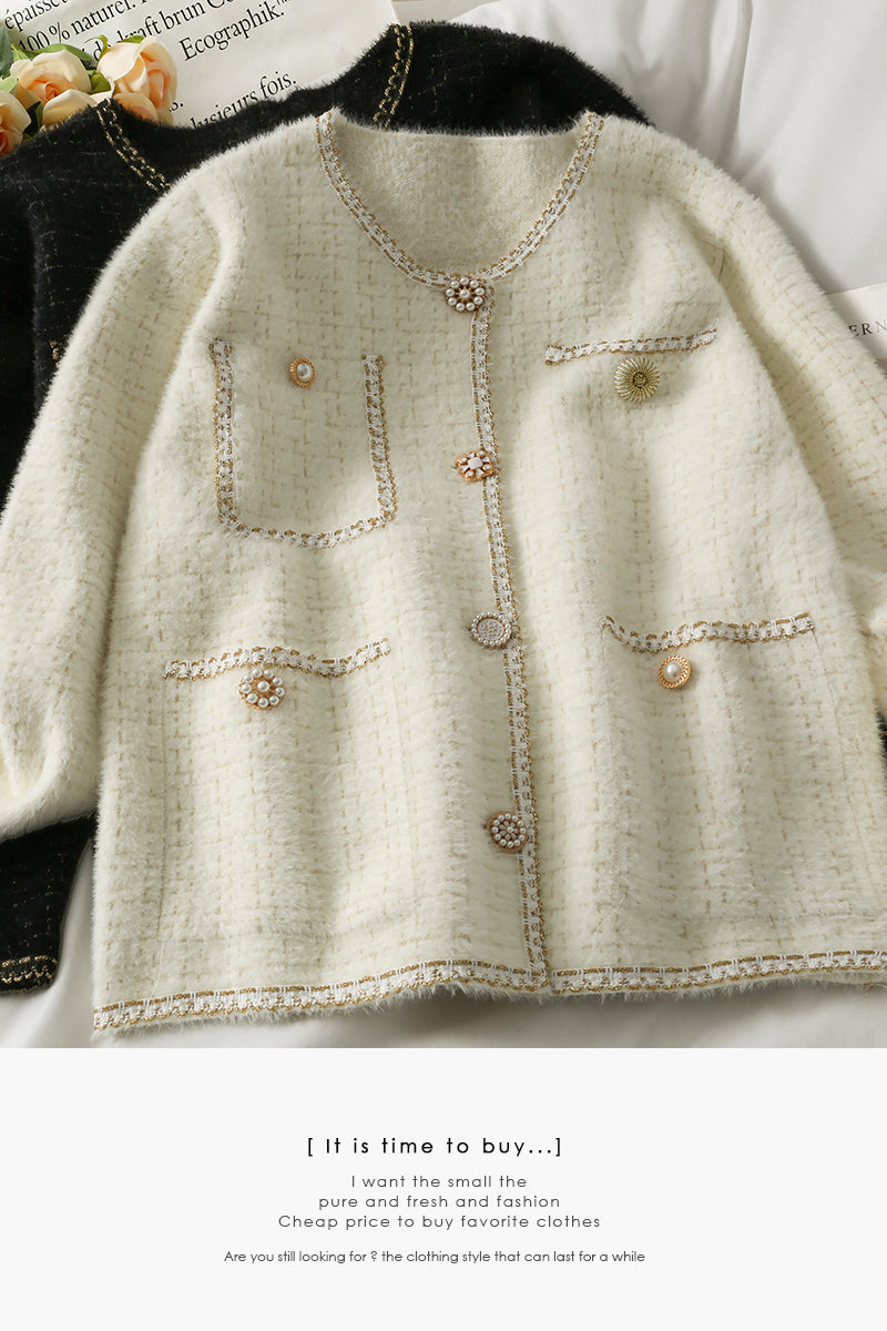 Bright silk Plaid round neck single breasted long sleeved sweater coat 1708