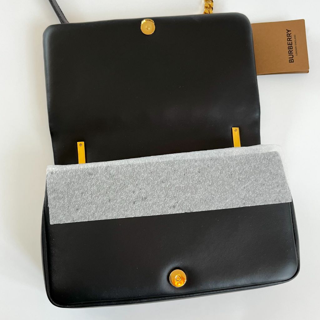 Burberry small quilted Lola shoulder bag with gold hardware features gold-tone Thomas Burberry monogram plaque, folder top, magnetic fastening, internal slip pocket and a quilted finish
