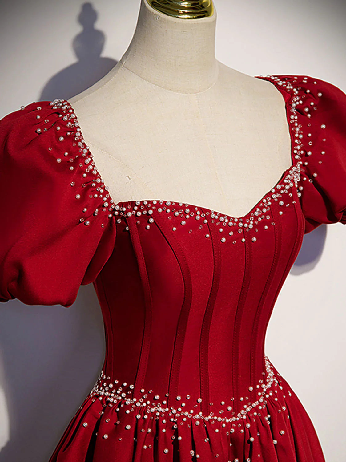 Burgundy A line satin beads long prom dress burgundy evening dress ED0824