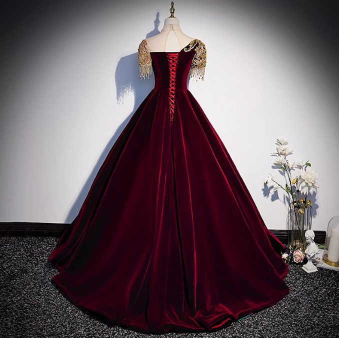 Burgundy A-line Velvet Beaded Sequined Long Prom Dress with Gold Appliques Formal Evening Gown ED01541
