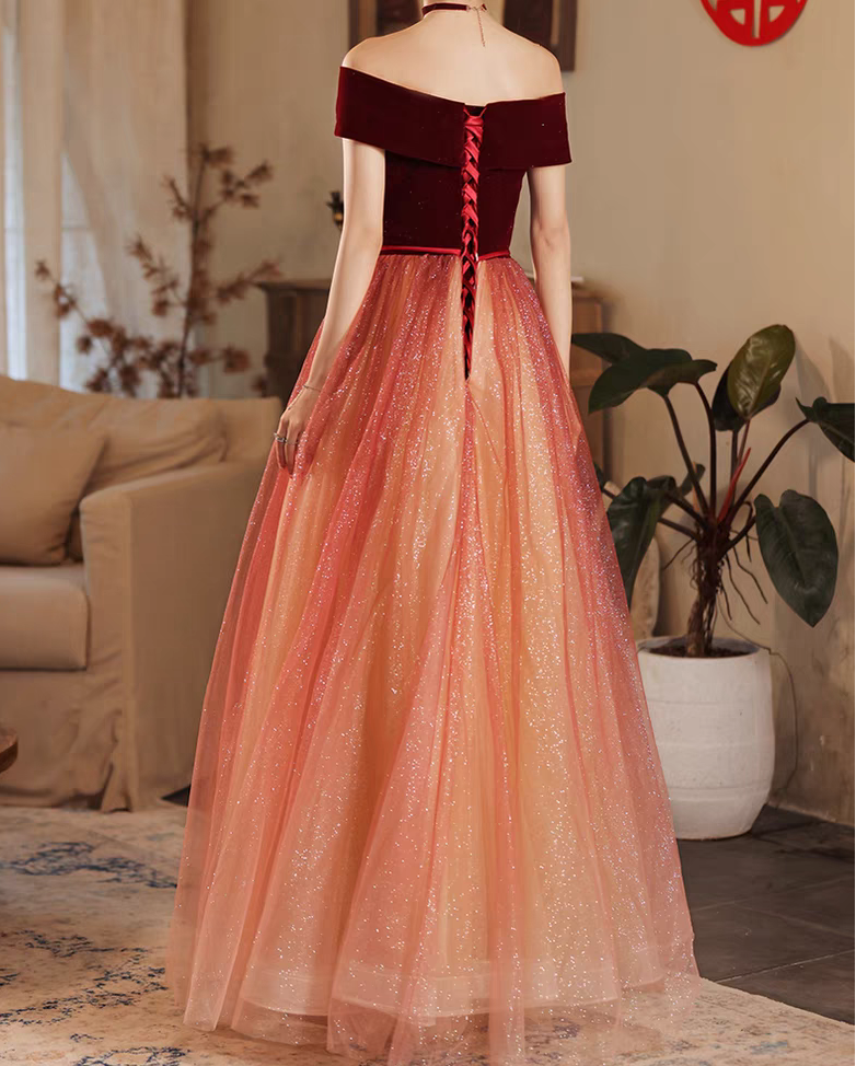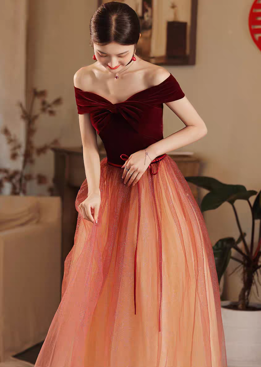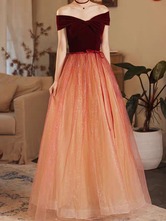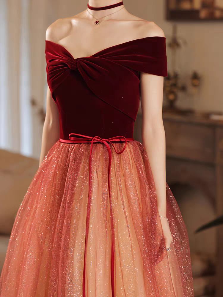 Burgundy off shoulder tulle long prom dress burgundy formal dress ED0820