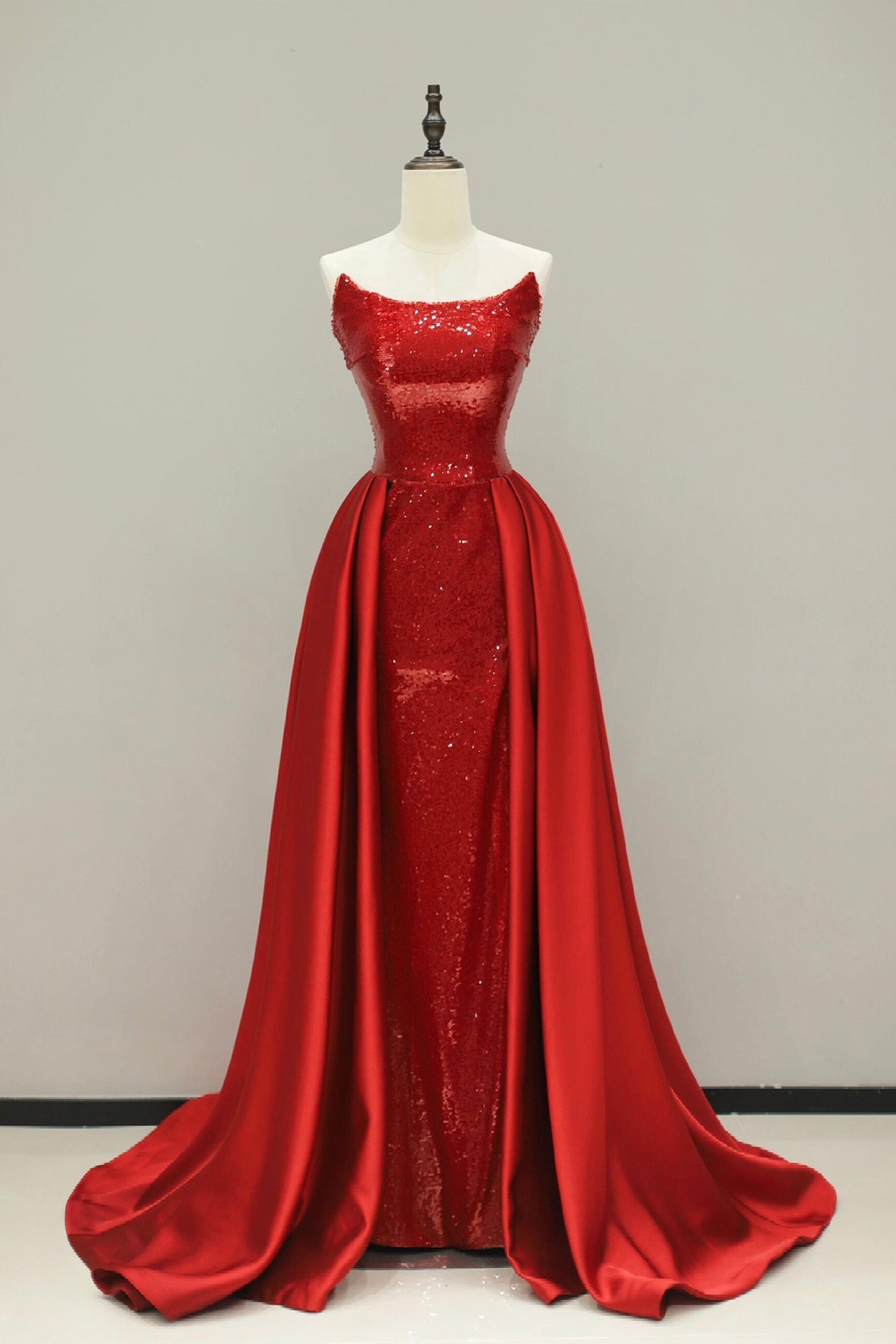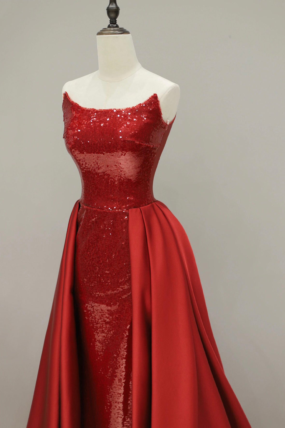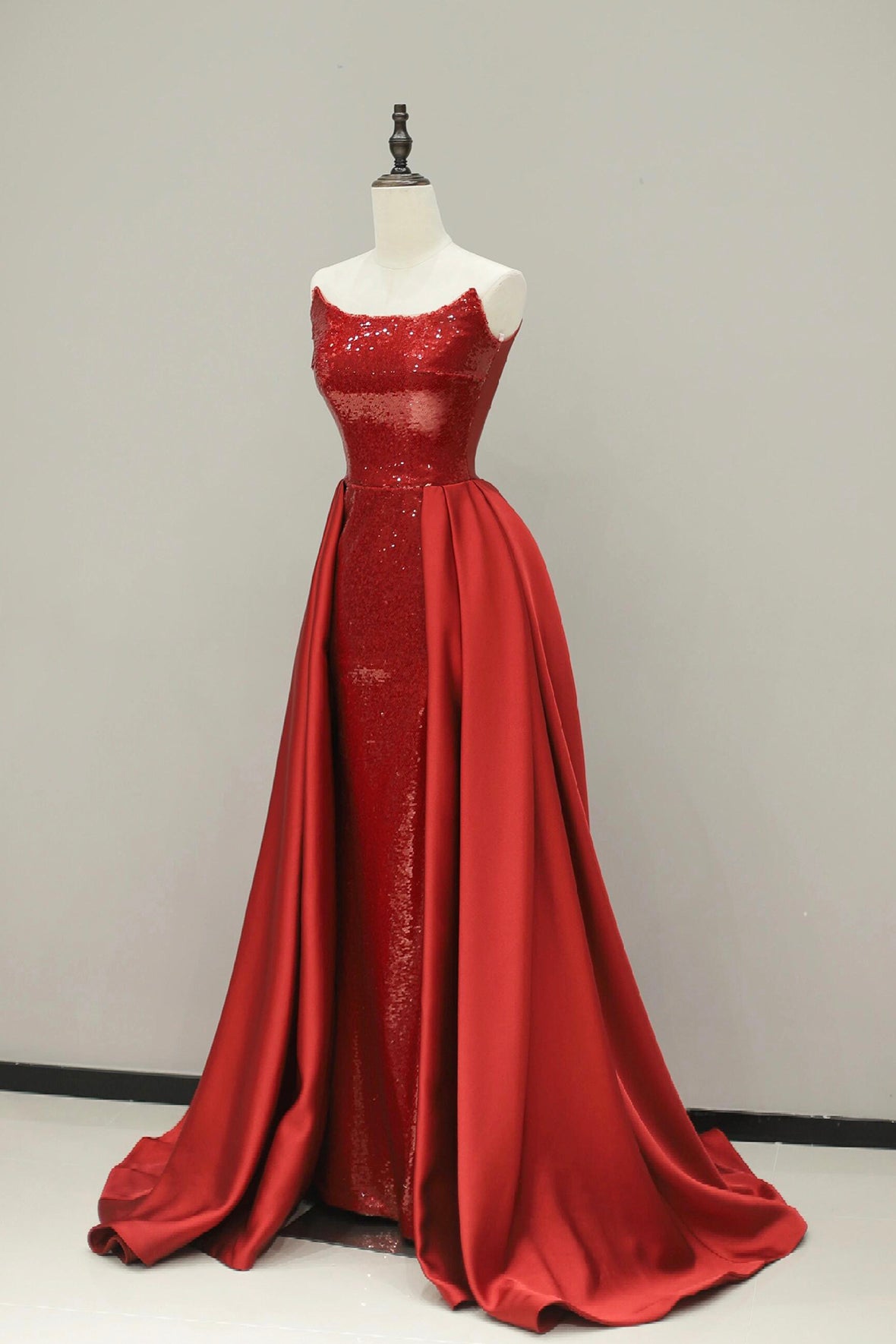 Prepare to shine like a star in this Burgundy Satin Sequins Long Prom Dress accents, a captivating choice for those glamorous evenings where you want to make a statement of elegance and sophistication.