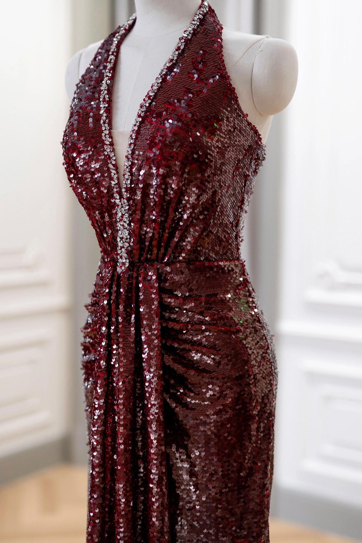 Burgundy Sequins Long Prom Dress, A-Line V-Neck Evening Party Dress