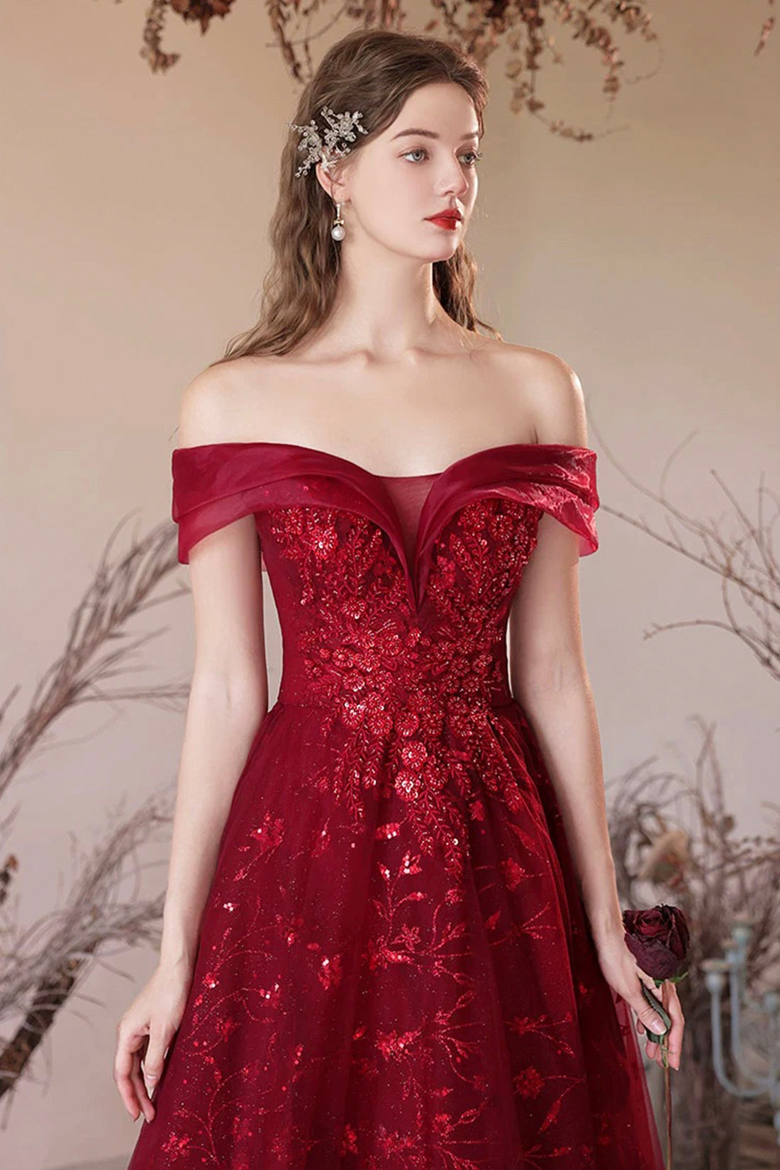 Burgundy Tulle Sequins Long A-Line Prom Dress, Off the Shoulder Evening Party Dress