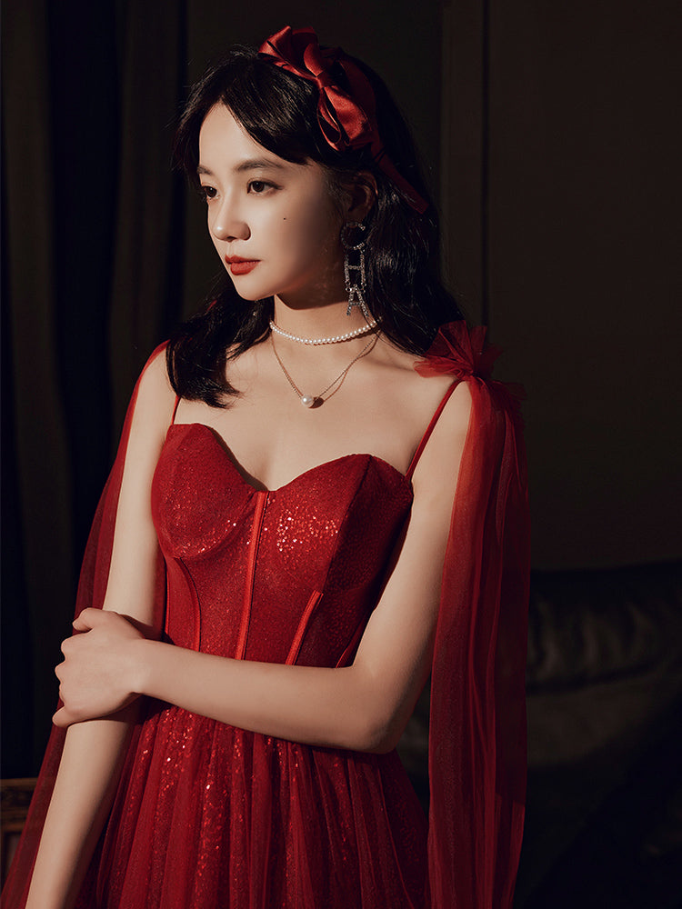 Burgundy Color Shiny Elegant Spaghetti Strap Long Tulle Sequin Ball Gown Evening Dress 8263