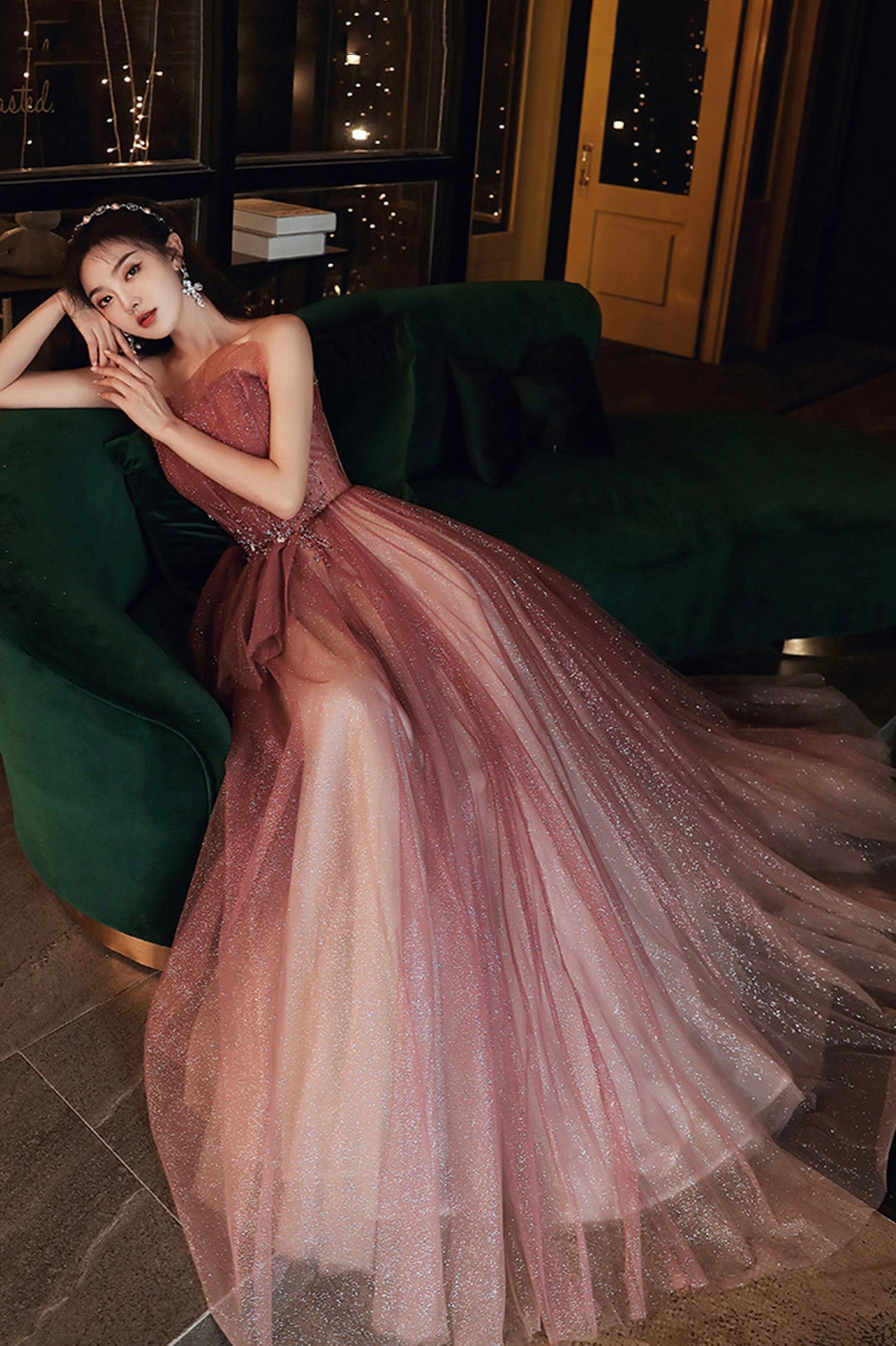 Burgundy tulle sequins long prom dress A line evening dress 10626