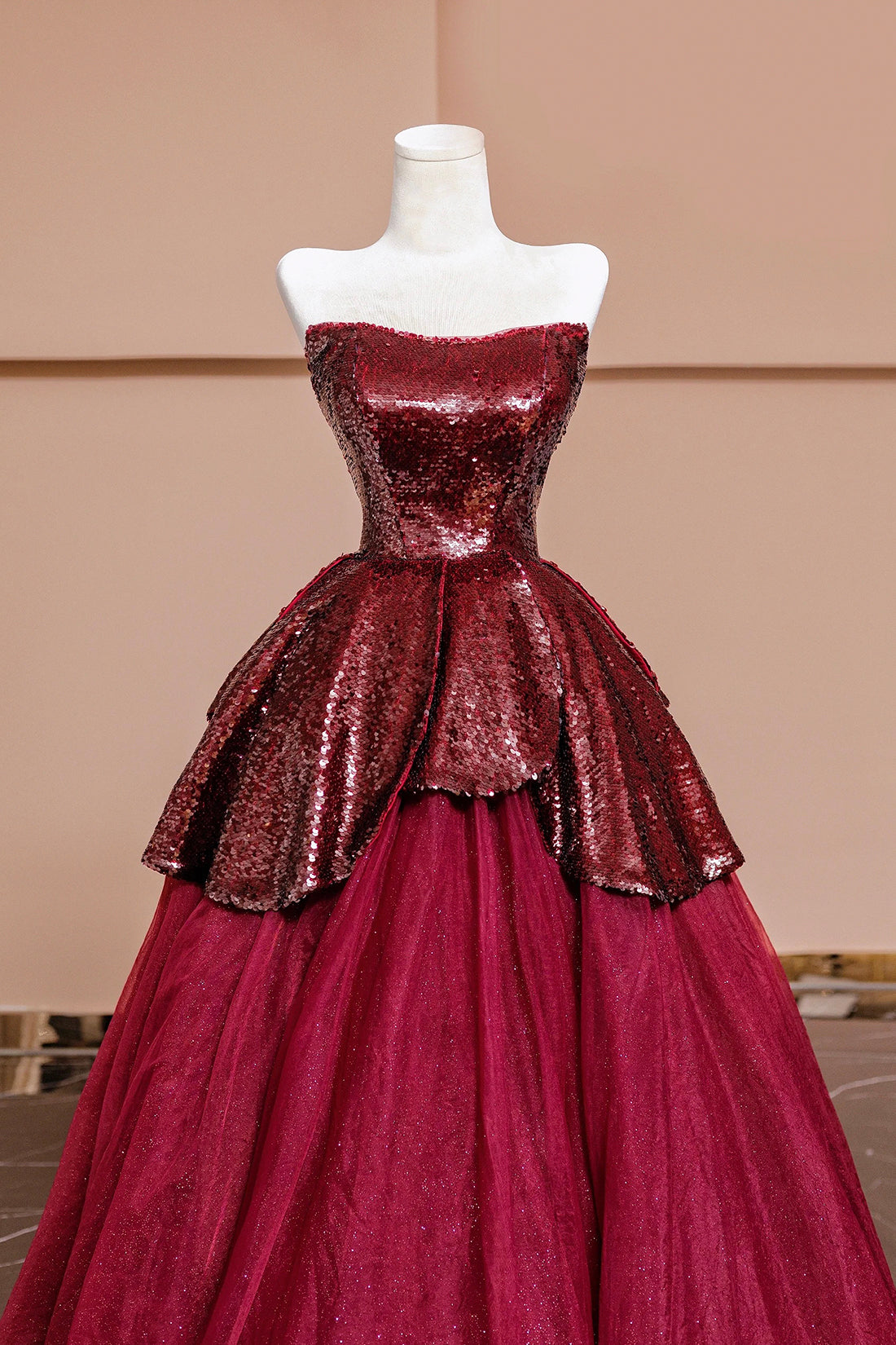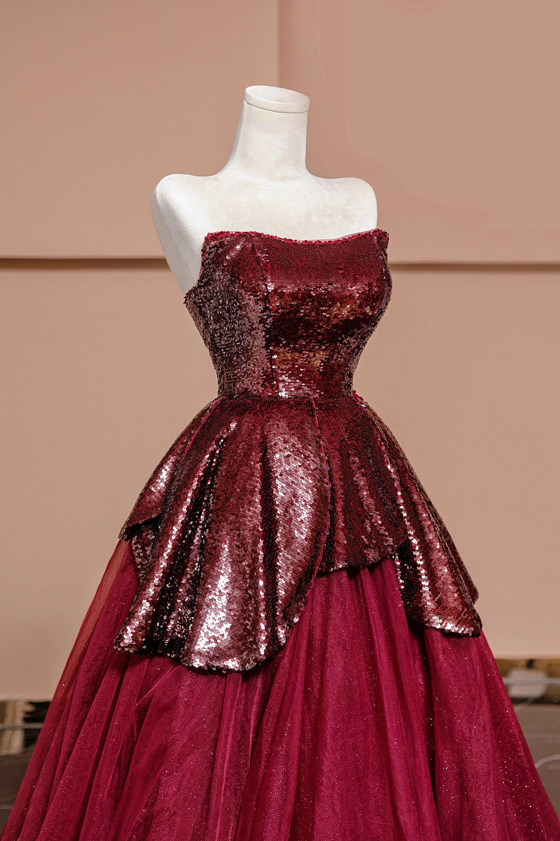 Burgundy Tulle Sequins Long Prom Dress, A-Line Strapless Evening Party Dress