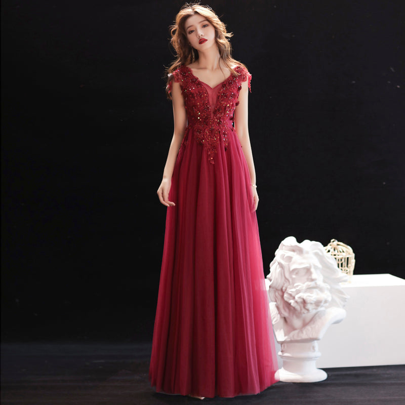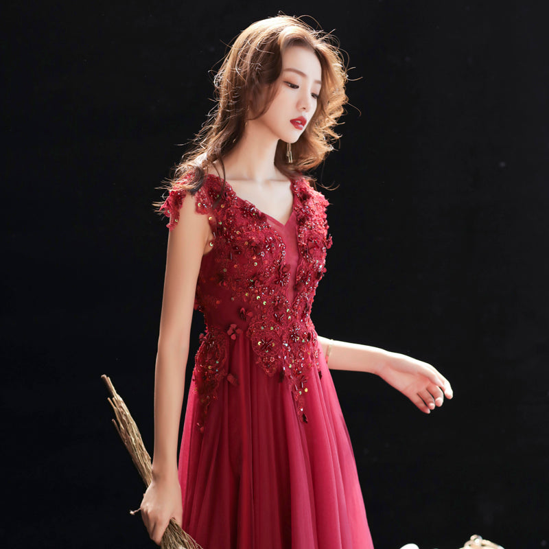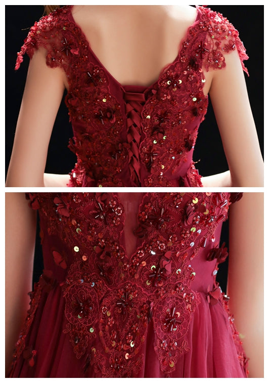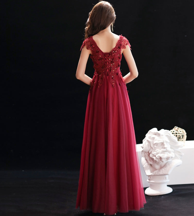 Burgundy v neck lace sequins long prom dress, evening dress 7968