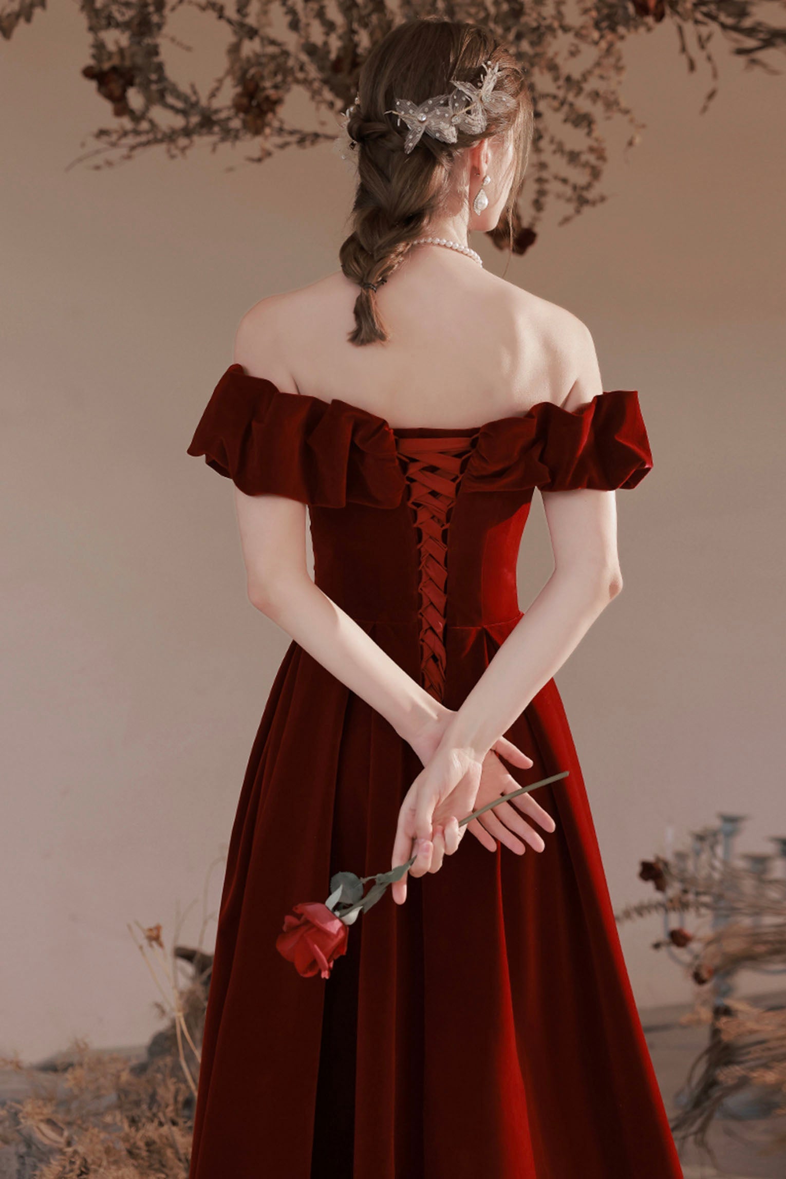 Introducing our Burgundy Velvet Long Prom Dress__n alluring A-line off-the-shoulder party dress. With its rich velvet fabric, this dress exudes elegance and charm. Perfect for prom or any special occasion, it will make you feel stunning and confident. Step into the spotlight and make a lasting impression in this captivating burgundy velvet dress.
