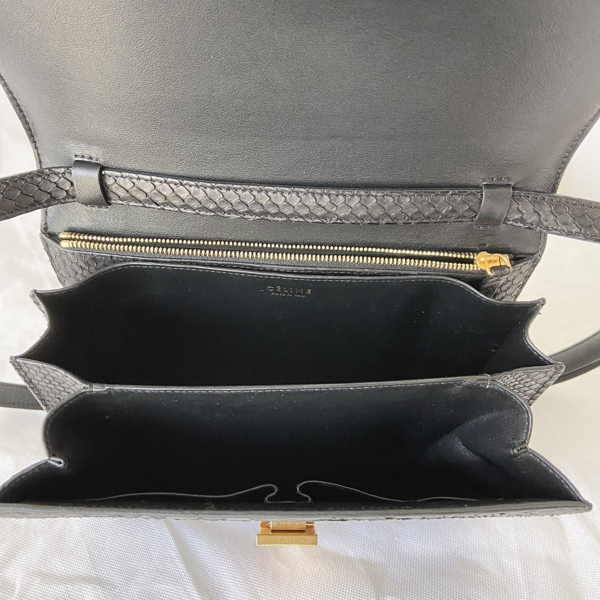 Description : Celine classic black Box bag in black python leather featuring gold-tone hardware. Clasp closure that opens into an interior with two compartments, one zip pocket and two open pockets. Has an adjustable crossbody (44 cm) strap. The bag is in excellent, like new condition. Inclusions: CITES, dust bag