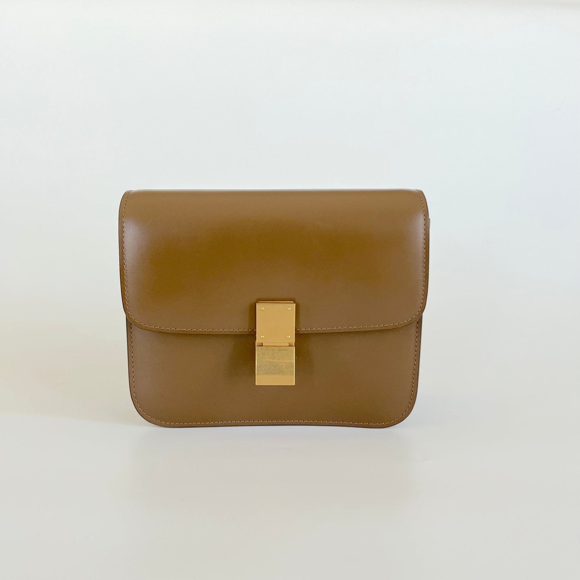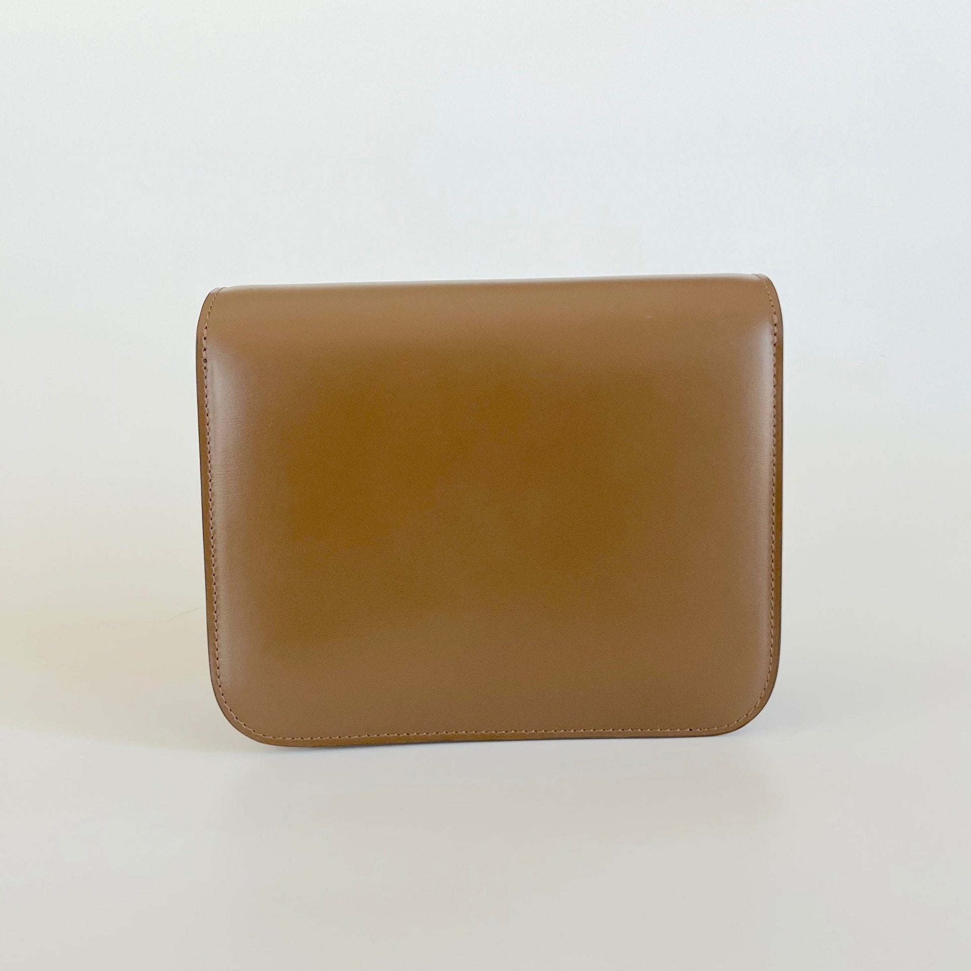 Celine teen box bag in camel calfskin, featuring gold-tone hardware, lambskin leather lining, can be worn as a clutch or worn across the body with the removable strap. Two inner compartments.
