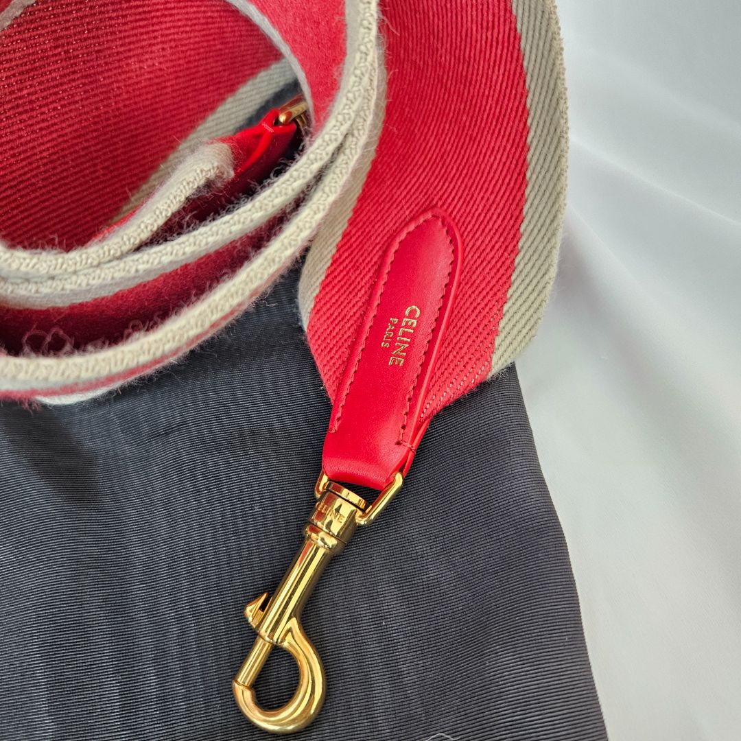 Celine Bucket 16 Bag comes with matching strap and a fabric ribbed strap and dust bag, features a front clasp, top handle, and long shoulder strap for versatile wear.