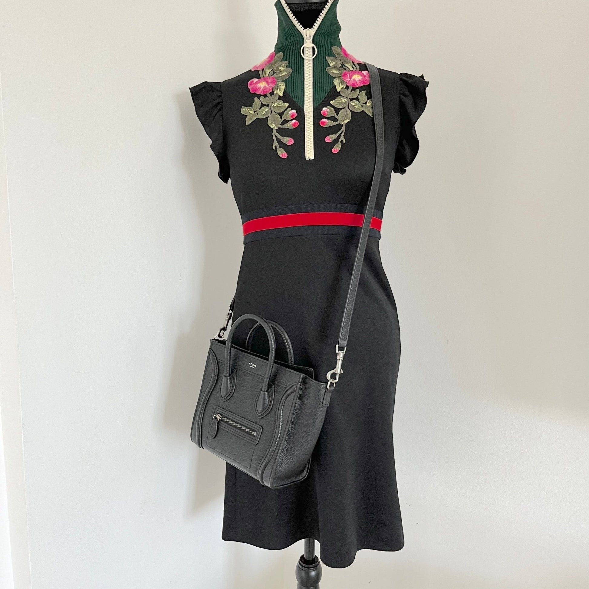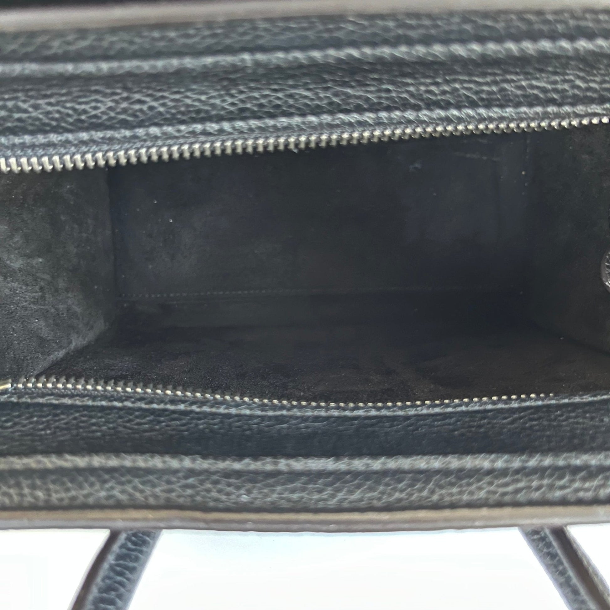 Celine black textured leather nano tote bag with detachable strap, featuring rolled top handles, a shoulder strap, and a front zip pocket with a leather lined spacious interior.