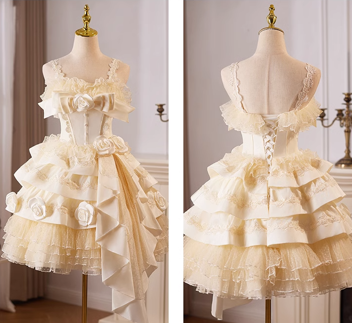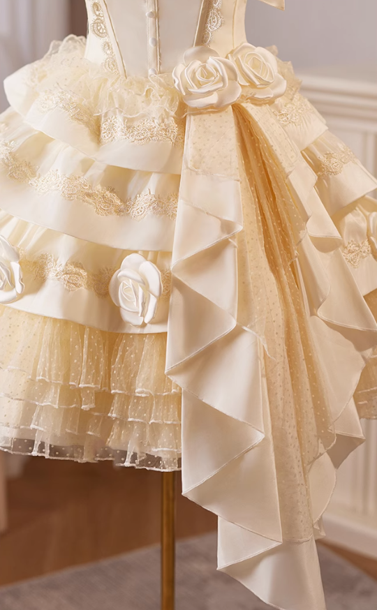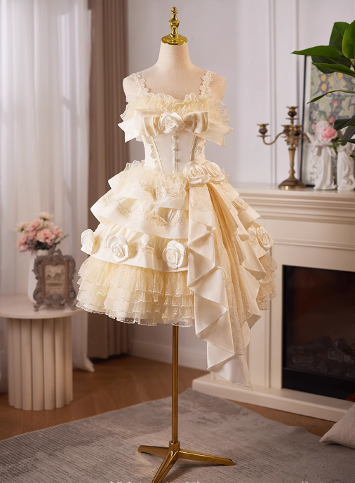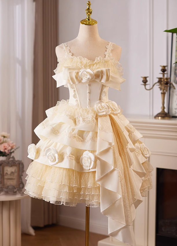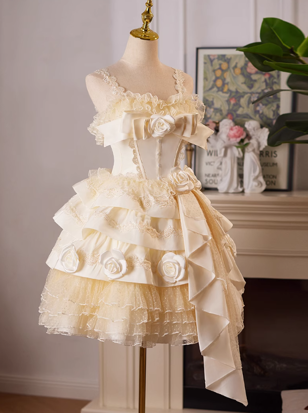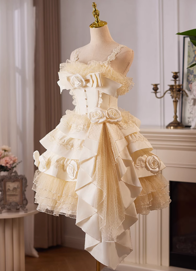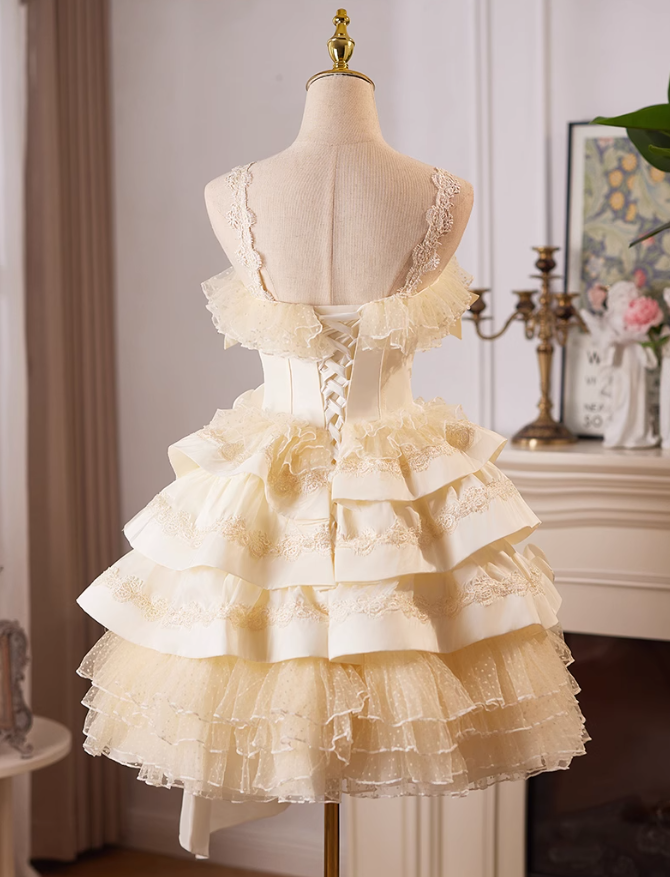 Champagne A-line satin tulle lace short prom dress, champagne birthday dress ED01107