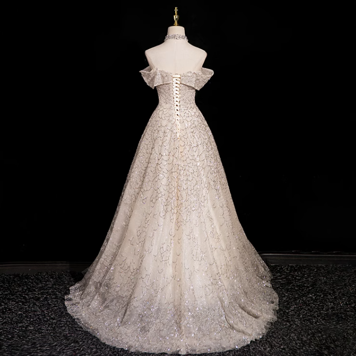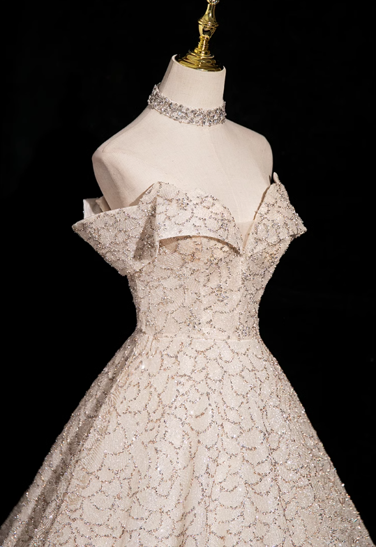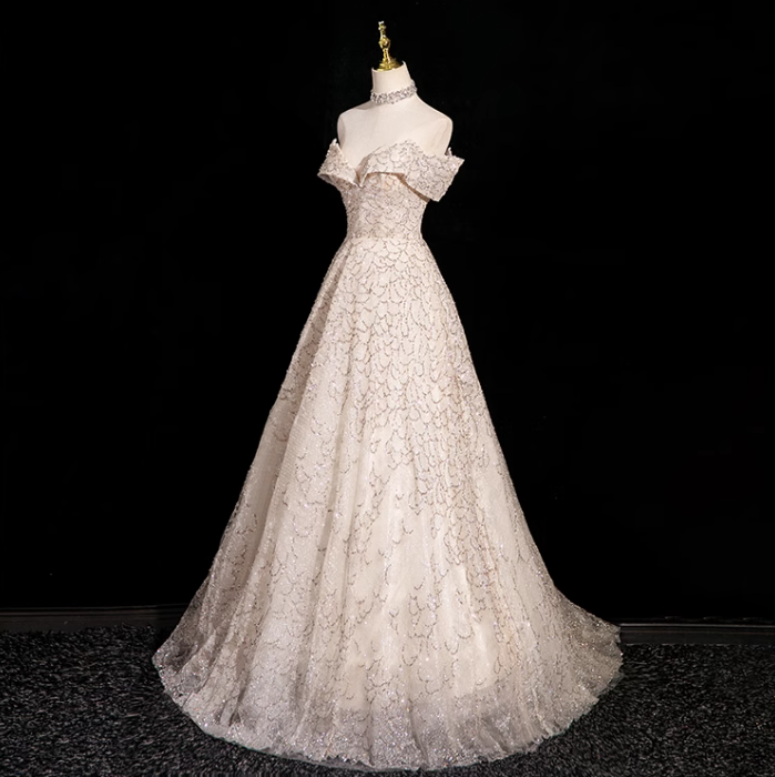 Champagne A-line V-neck mesh sequin long prom dress, champagne formal long dress ED01146
