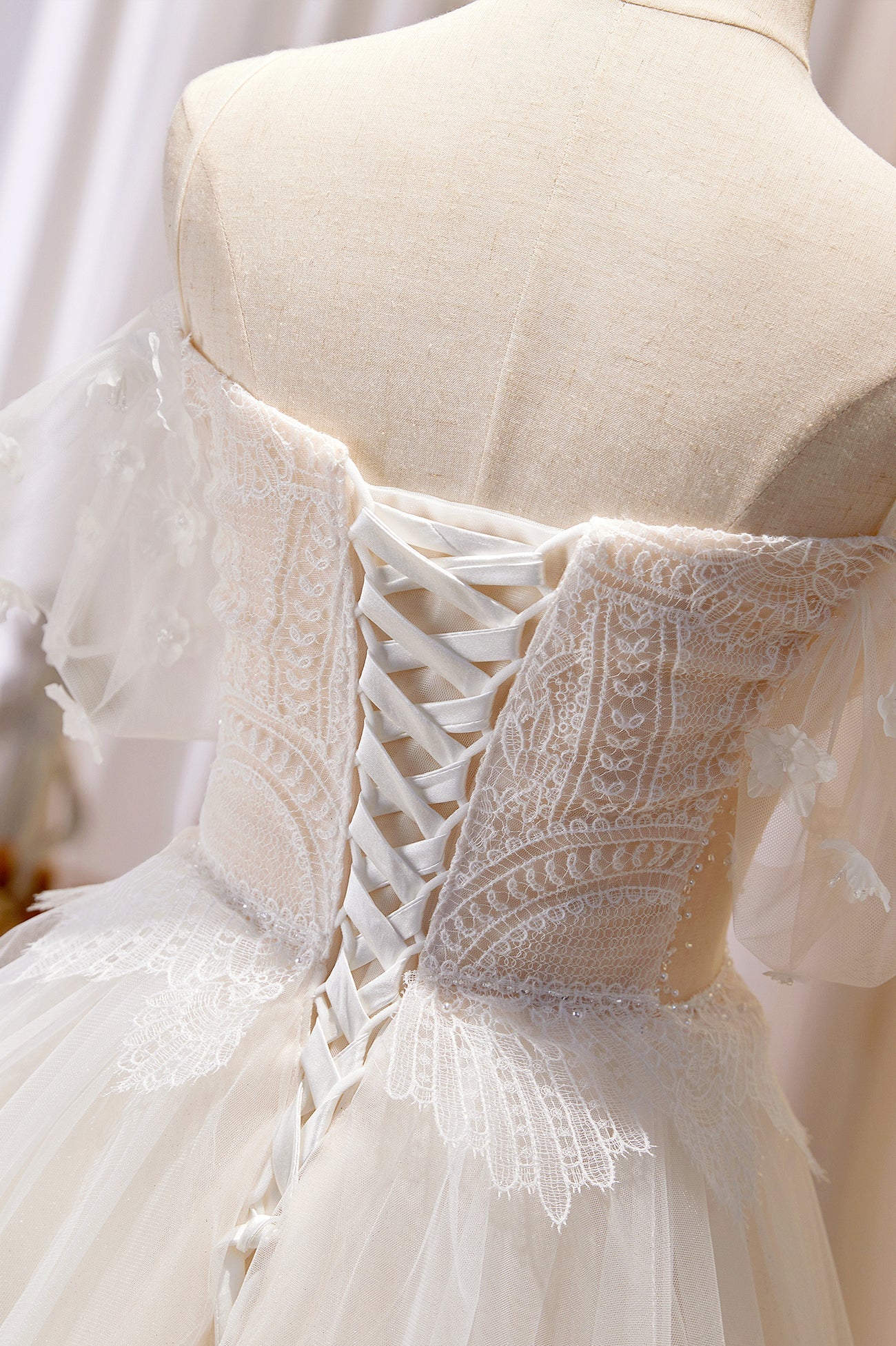 Champagne Floor Length Lace Long Prom Dress, Off the Shoulder Evening Dress