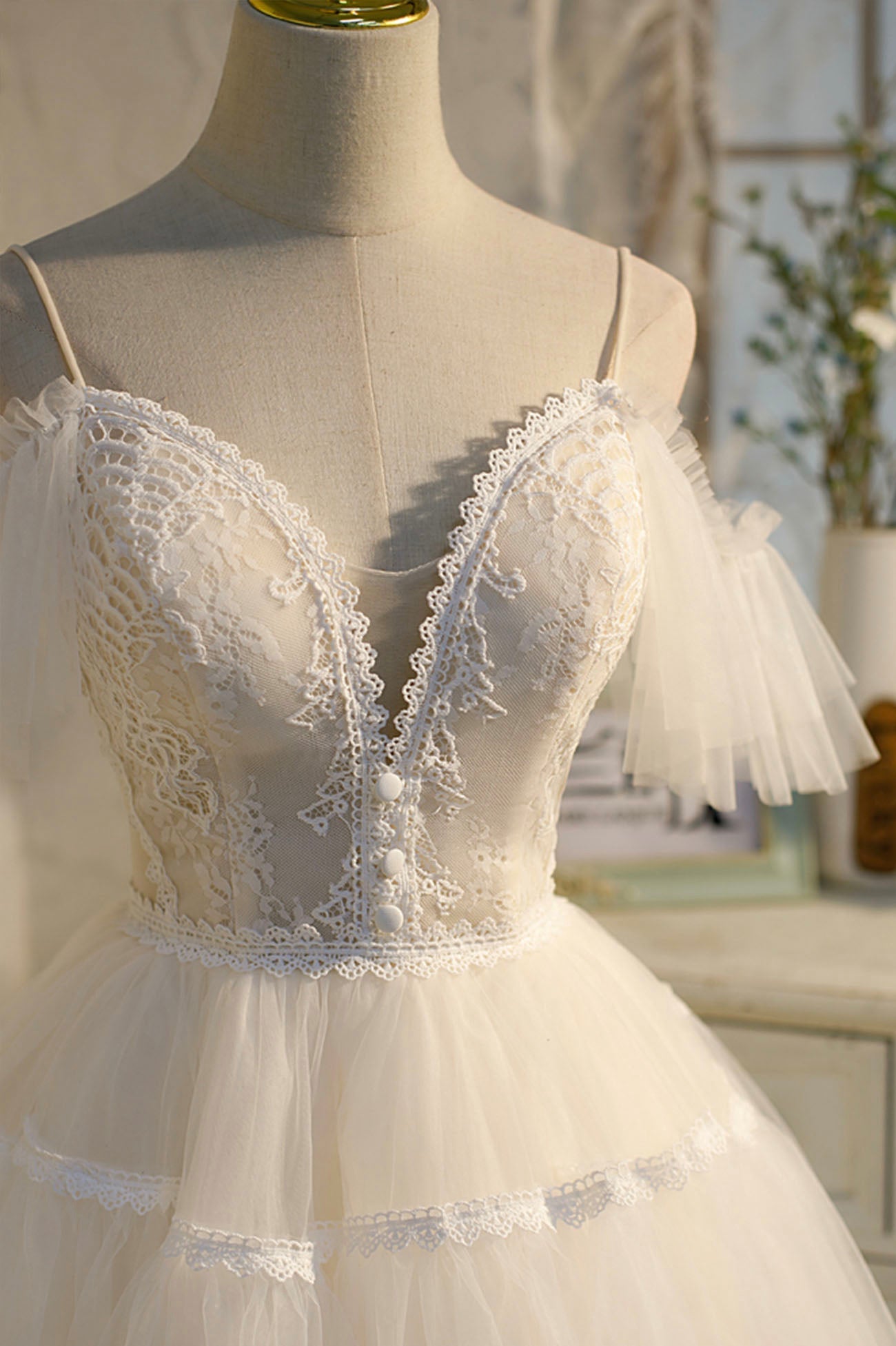 Champagne Spaghetti Straps Lace Short Prom Dress, A-Line Party Dress