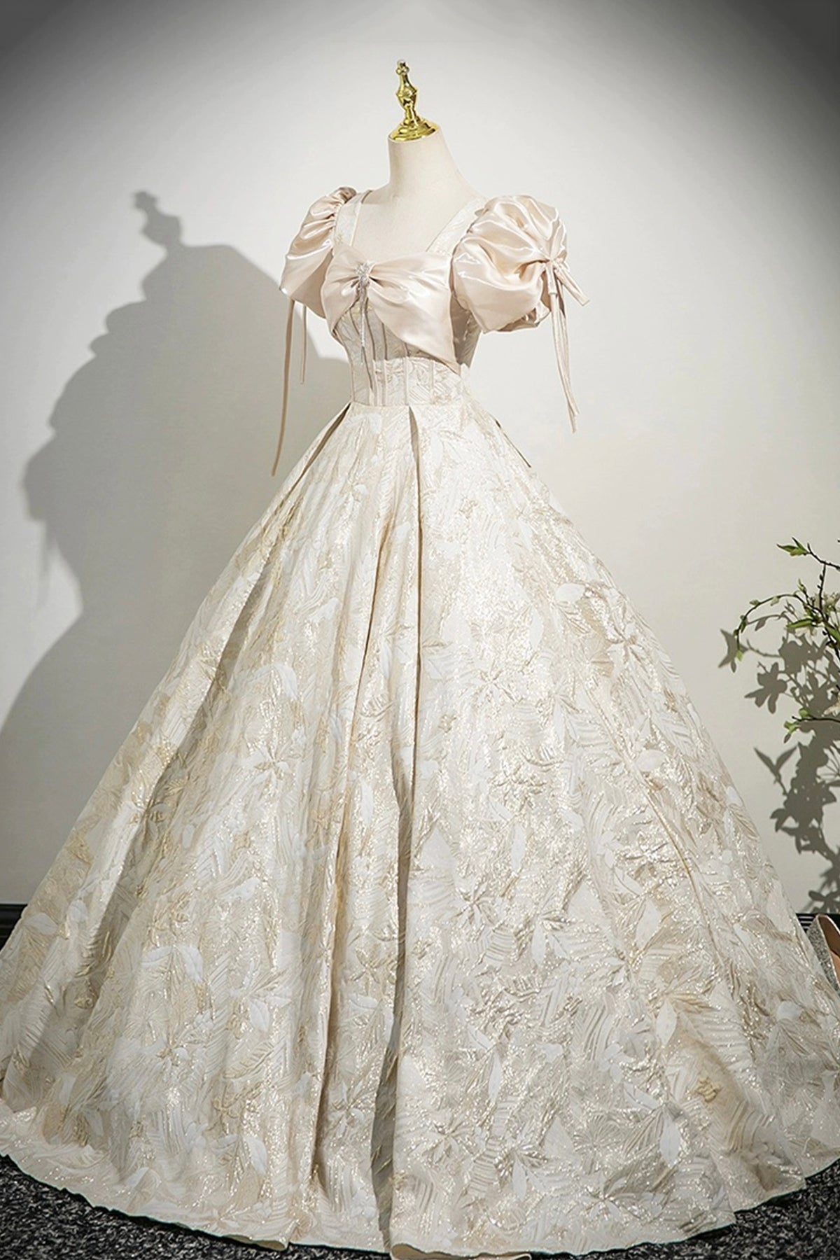 Champagne Satin Printed Floor Length Prom Dress, A-Line Short Sleeve Party Dress