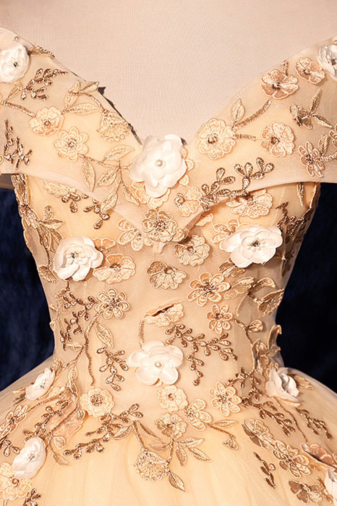 Champagne V-Neck Lace Long Ball Gown, Off the Shoulder Formal Evening Dress