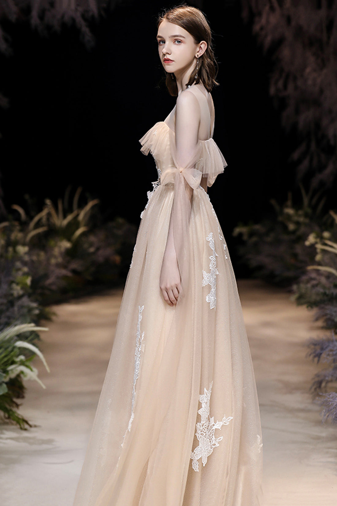 Champagne Tulle Lace Long Prom Dress, Cute A-Line Evening Dress