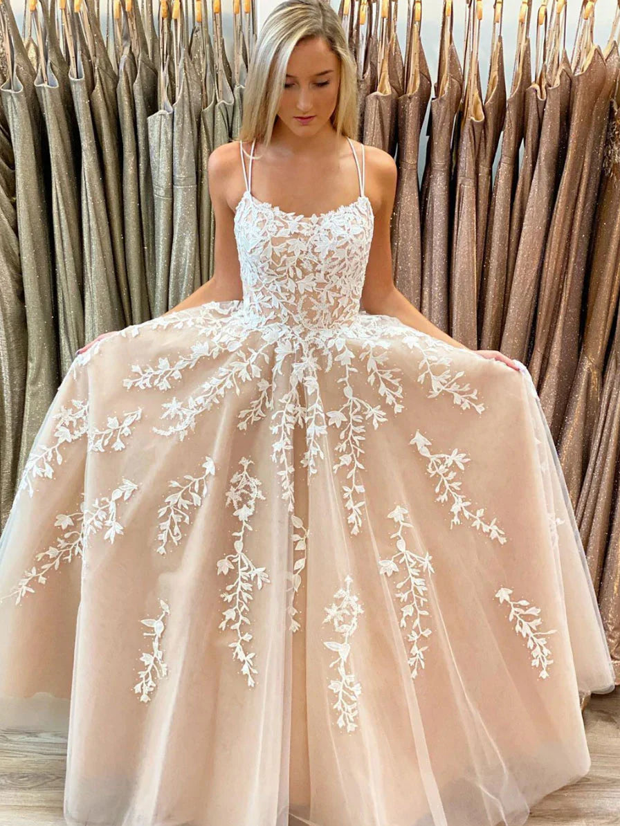 Champagne tulle lace long prom dress lace tulle evening dress ED0876
