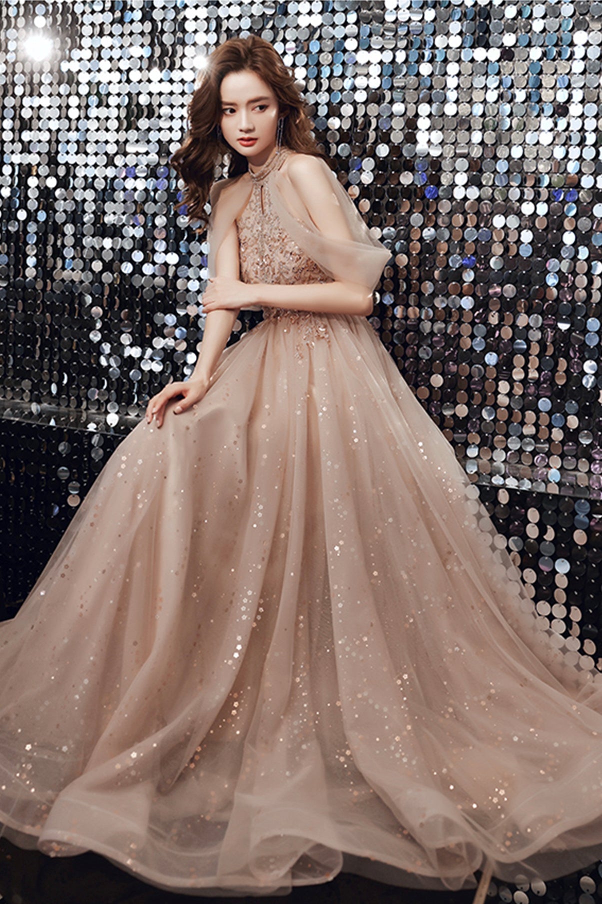 Champagne tulle sequins long A line prom dress evening dress 8683