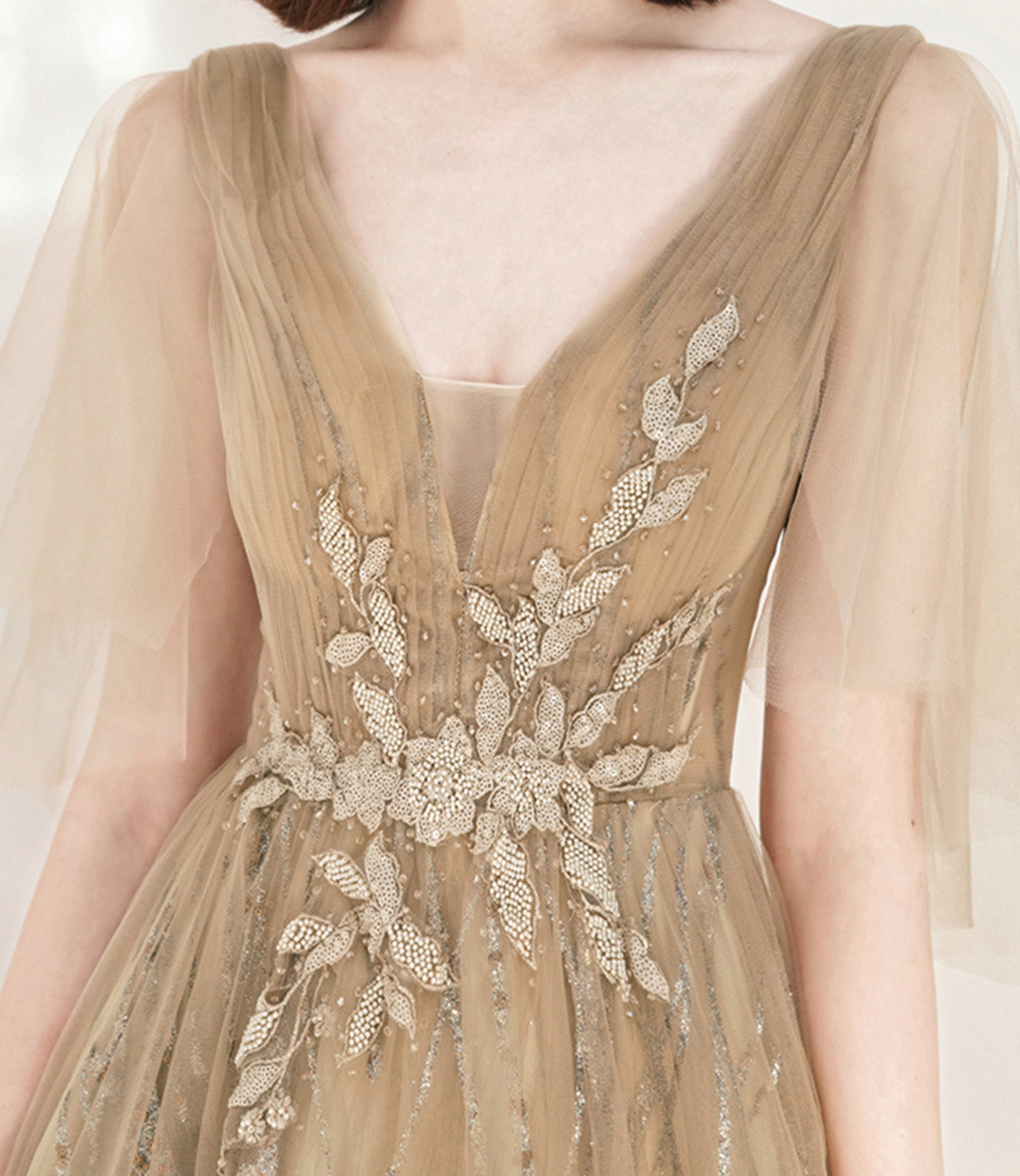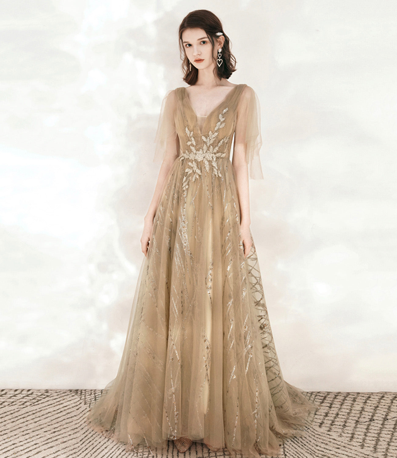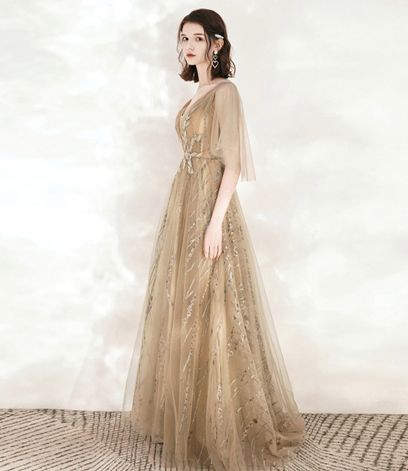 Champagne tulle sequins long prom dress A line evening dress 10548