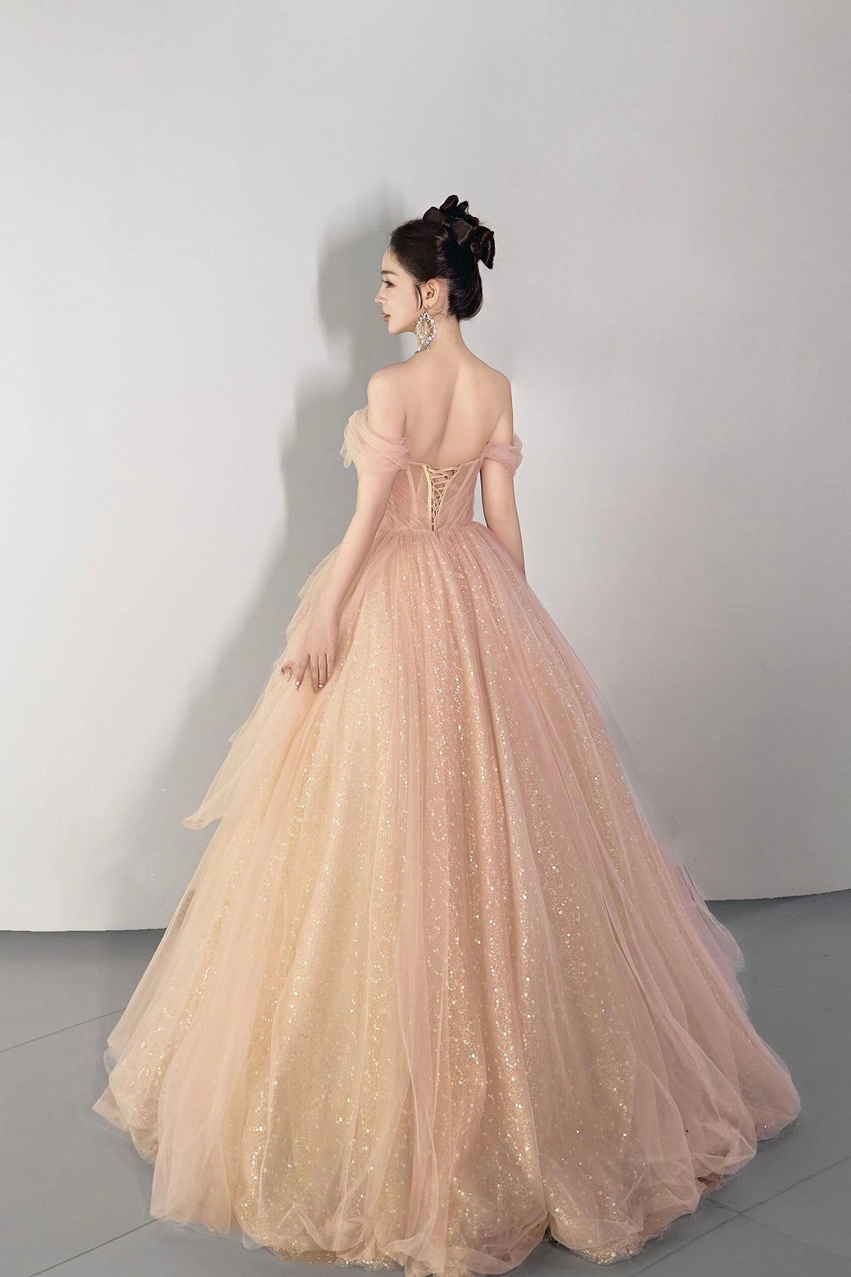 Champagne Tulle Sequins Long Prom Dress, Beautiful Off the Shoulder Party Dress