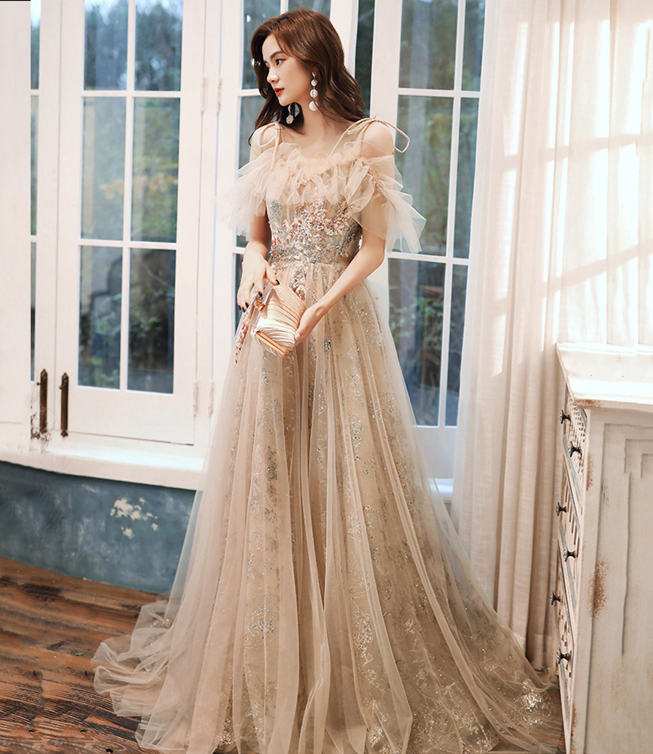 Champagne tulle sequins long prom dress evening dress