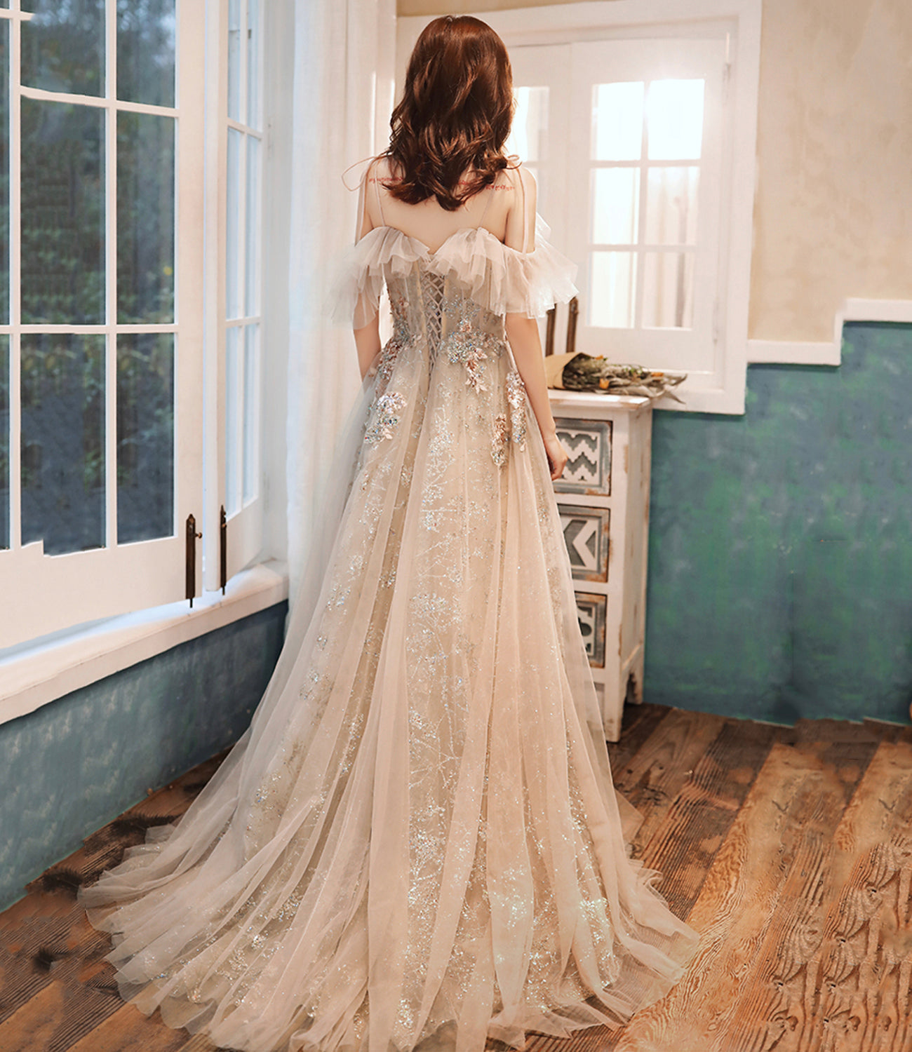 Champagne tulle sequins long prom dress evening dress 10390