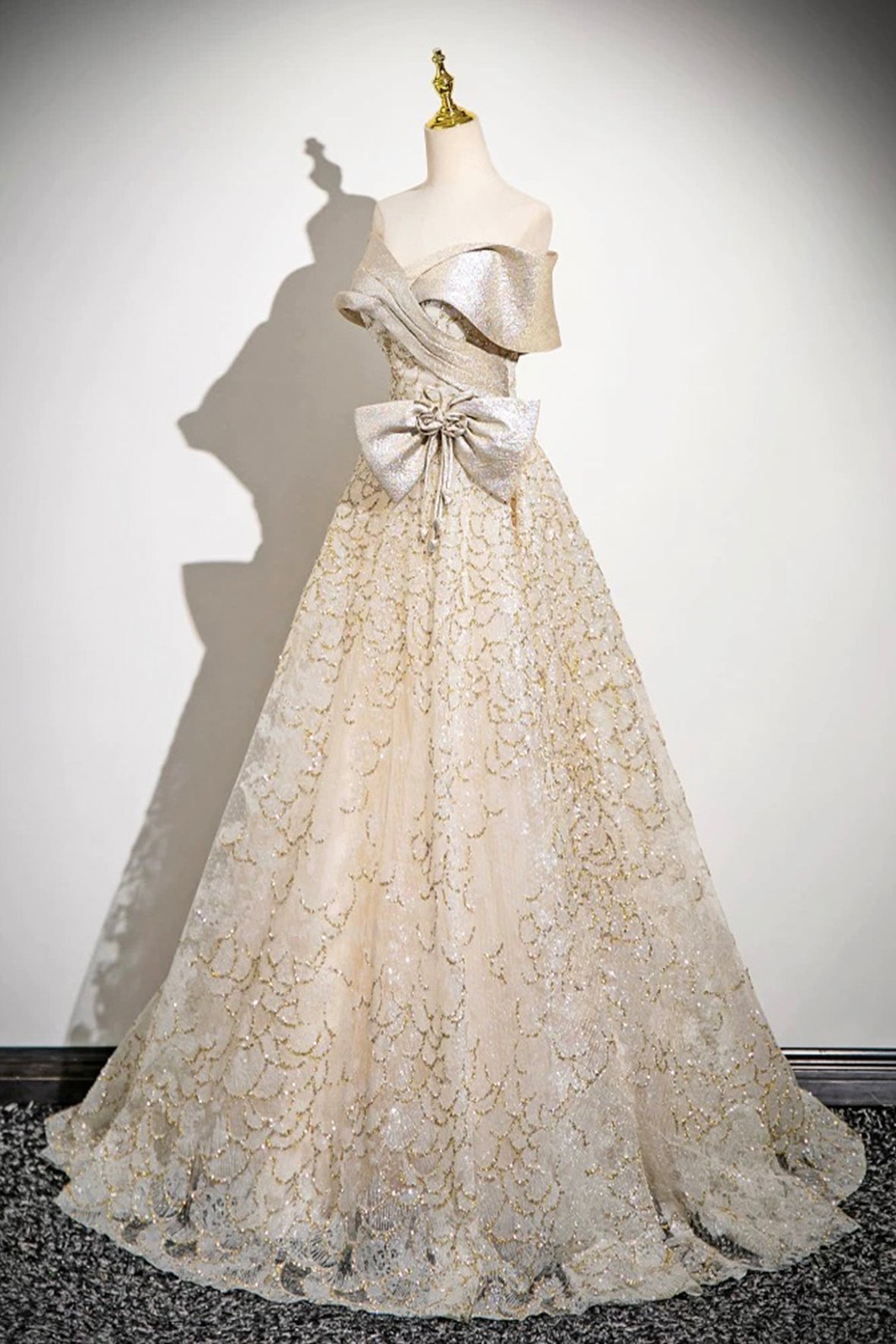 Champagne Tulle Sequins Long Prom Dress, Off the Shoulder Evening Party Dress