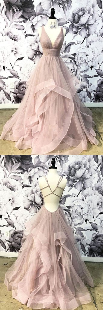 CHAMPAGNE V NECK TULLE LONG PROM DRESS, TULLE EVENING DRESS cg494