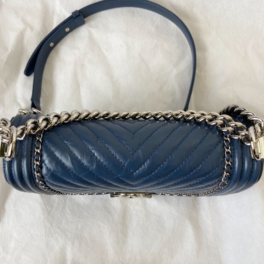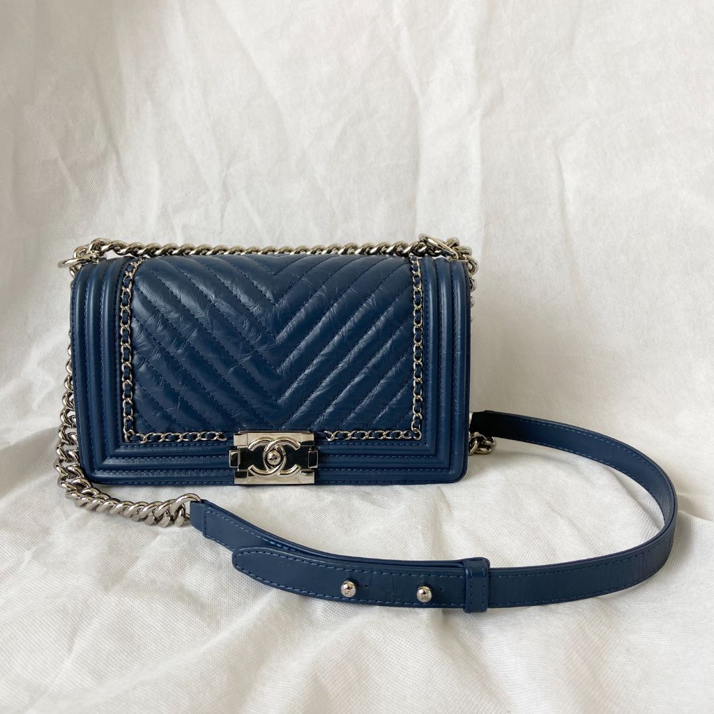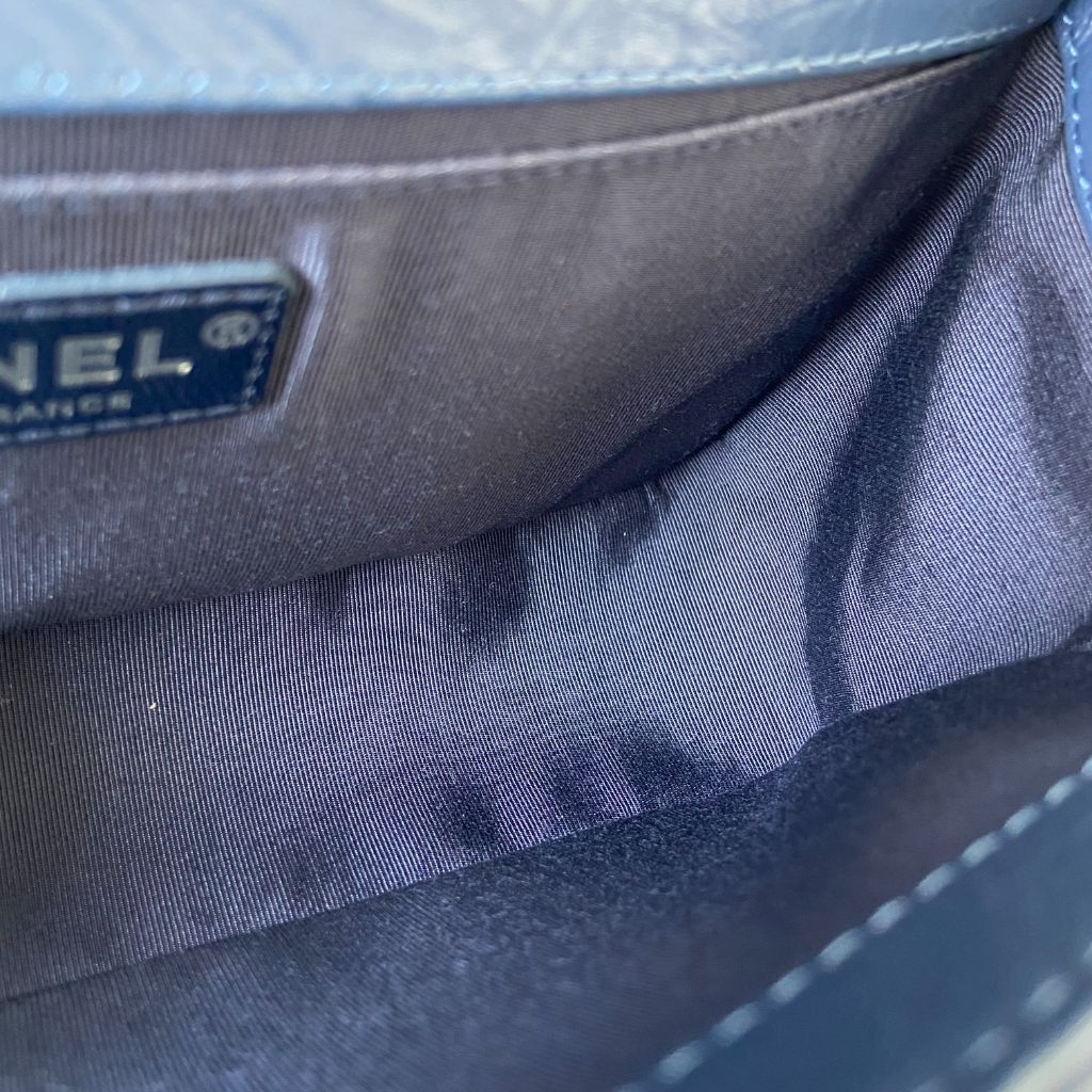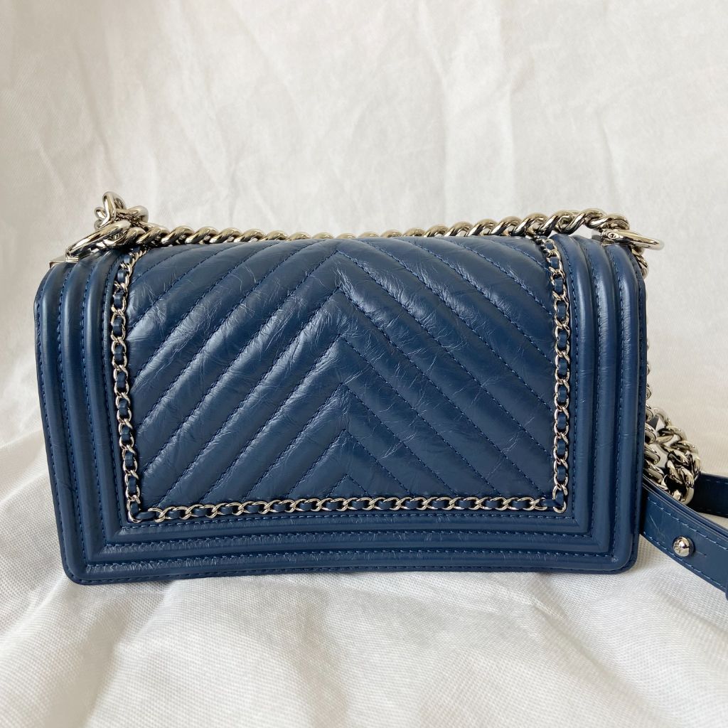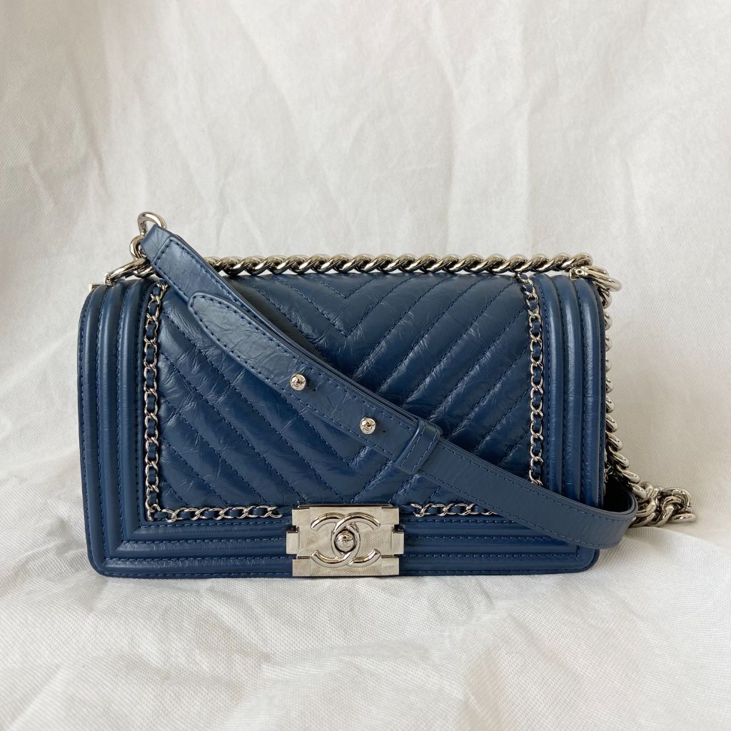 Chanel Aged Calfskin Chevron Quilted Medium Jacket Boy Flap in blue with silver hardware, with a chevron quilting with a chain detail between the chevron pattern all framed by linear quilting, bag features a polished silver chain link and shoulder pad shoulder strap with a polished silver Boy Chanel CC press lock for the facing flap, opens to an ivory fabric interior with a long patch pocket