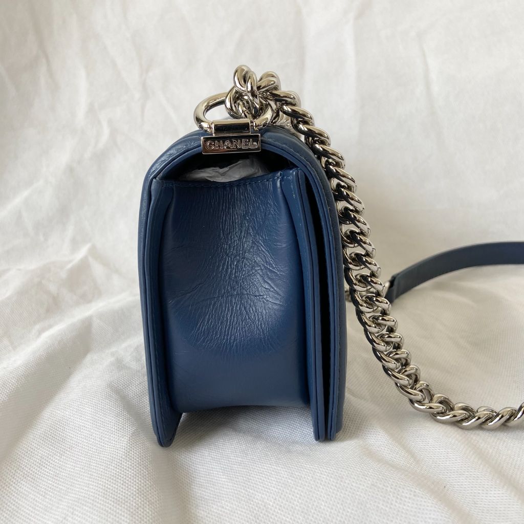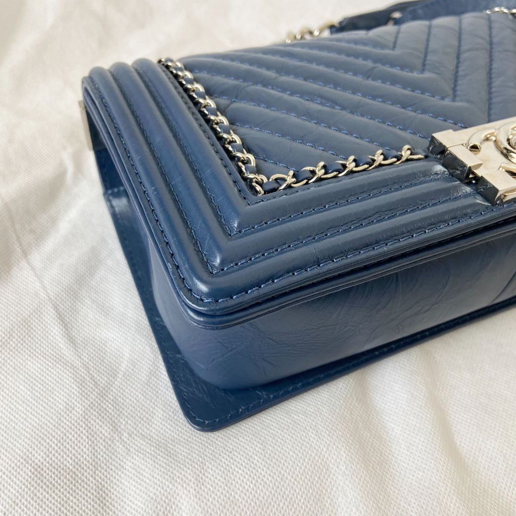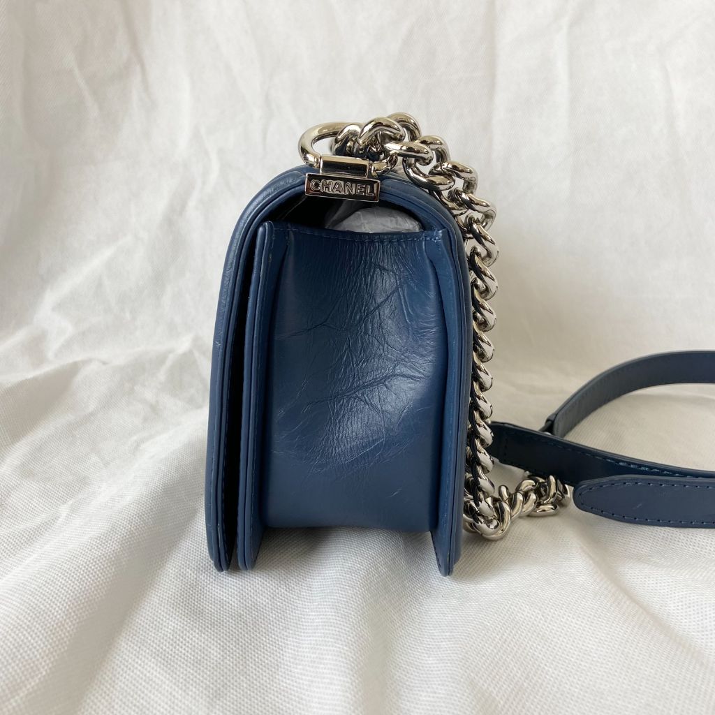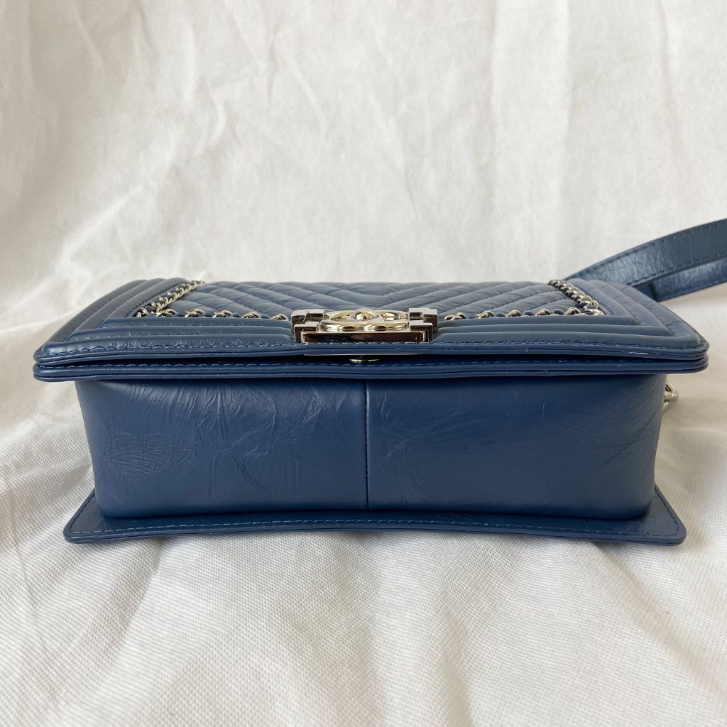 Chanel Aged Calfskin Chevron Quilted Medium Jacket Boy Flap in blue with silver hardware, with a chevron quilting with a chain detail between the chevron pattern all framed by linear quilting, bag features a polished silver chain link and shoulder pad shoulder strap with a polished silver Boy Chanel CC press lock for the facing flap, opens to an ivory fabric interior with a long patch pocket