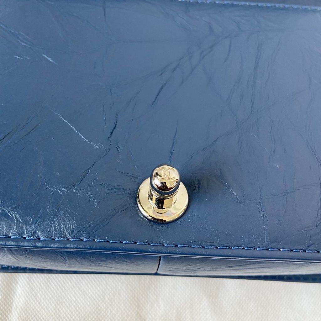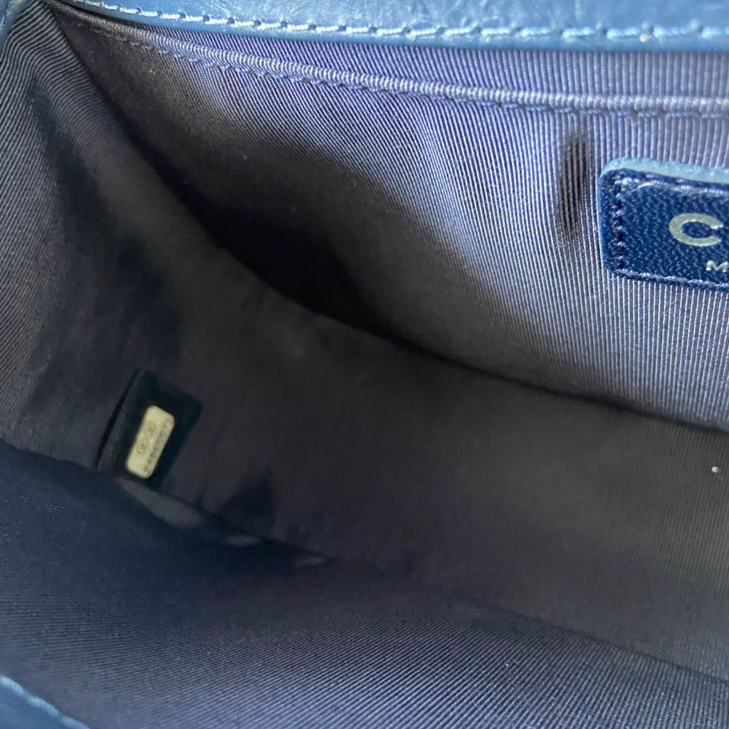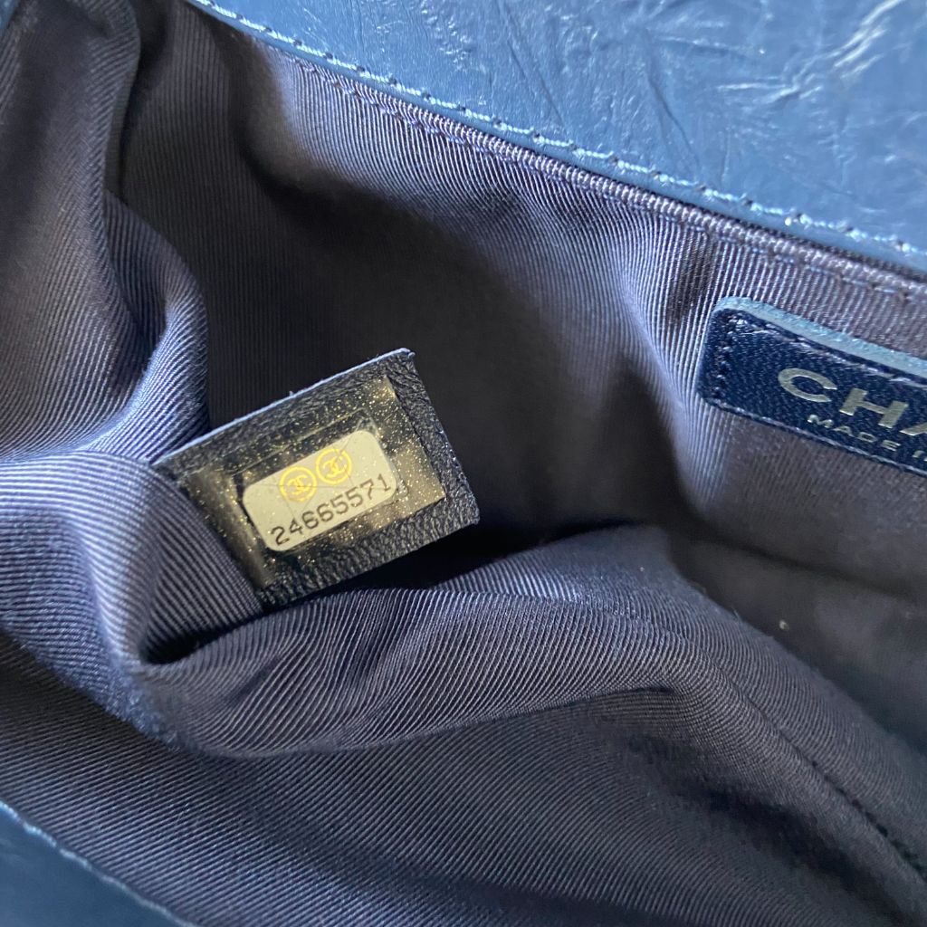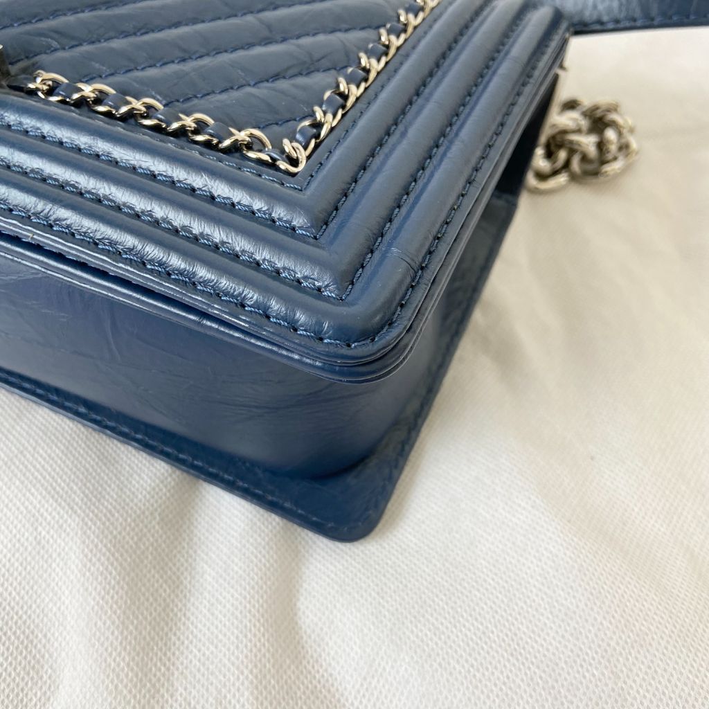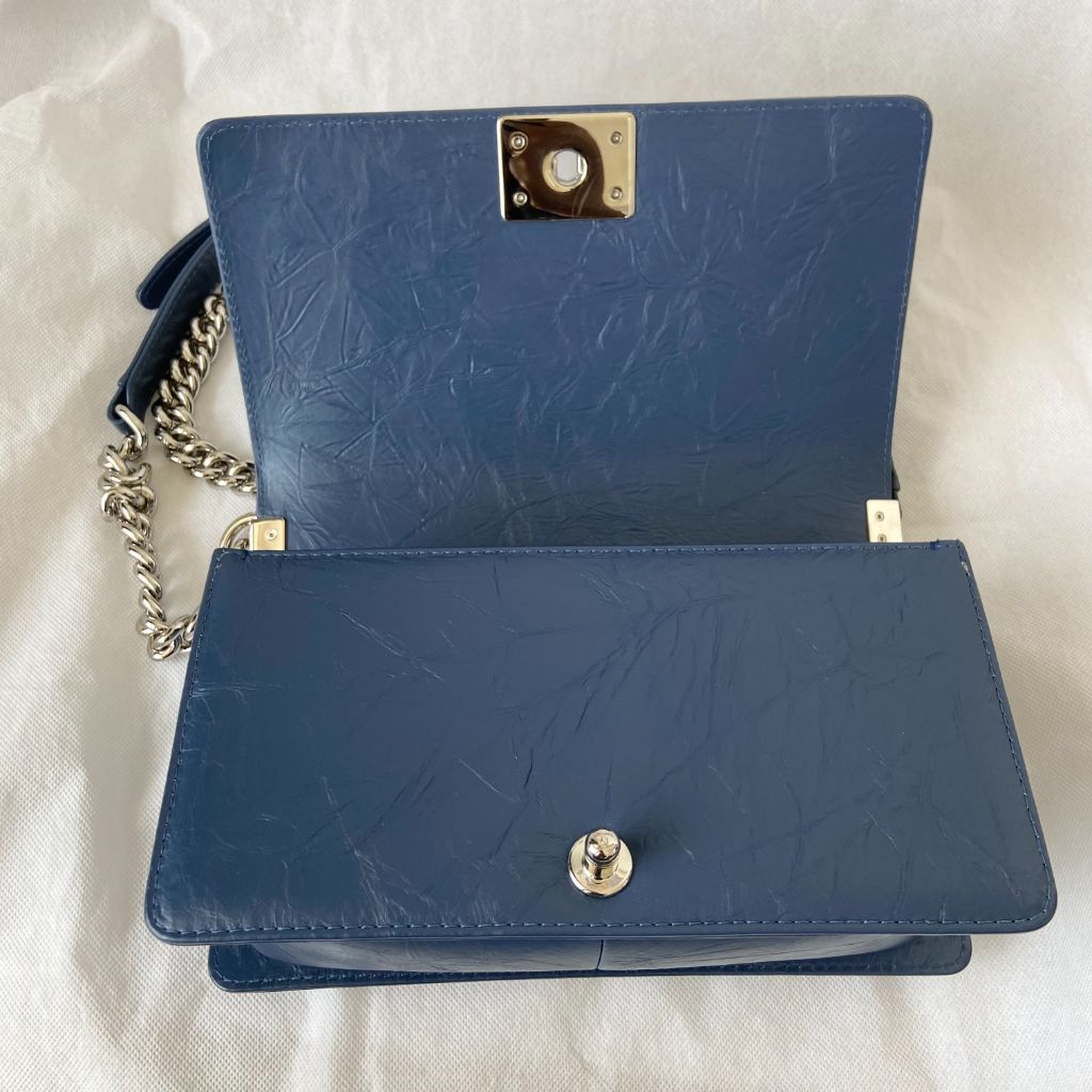 Chanel Aged Calfskin Chevron Quilted Medium Jacket Boy Flap in blue with silver hardware, with a chevron quilting with a chain detail between the chevron pattern all framed by linear quilting, bag features a polished silver chain link and shoulder pad shoulder strap with a polished silver Boy Chanel CC press lock for the facing flap, opens to an ivory fabric interior with a long patch pocket