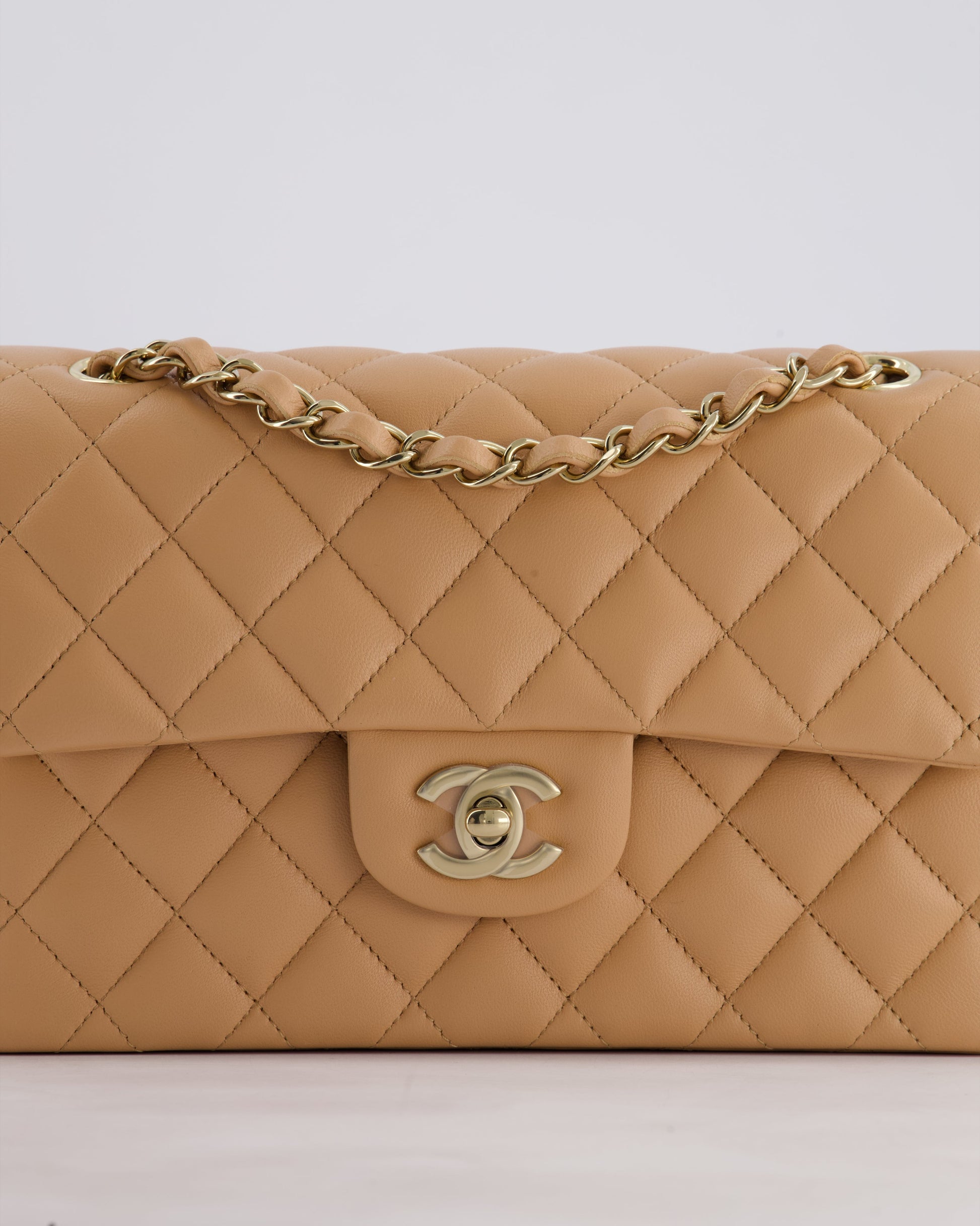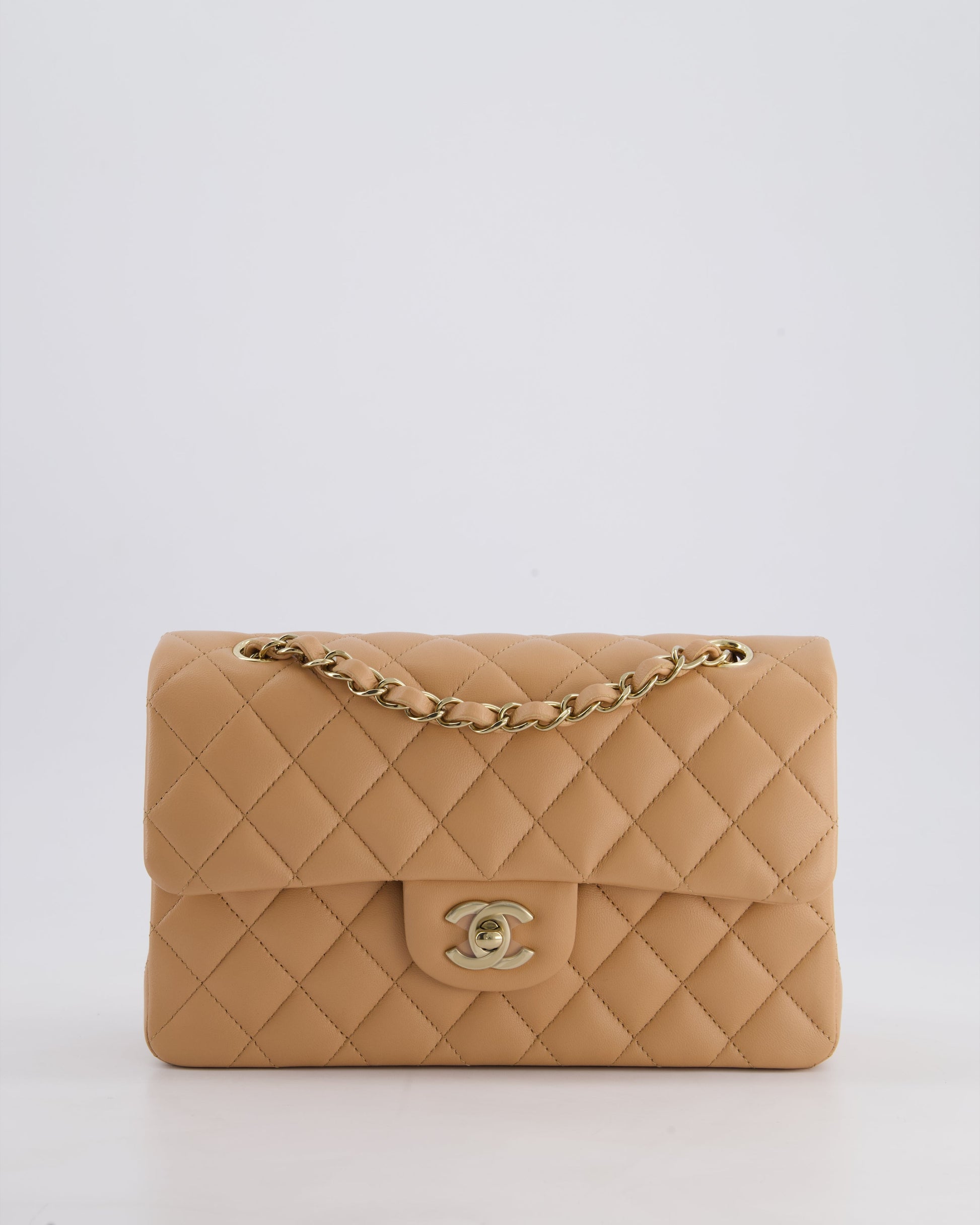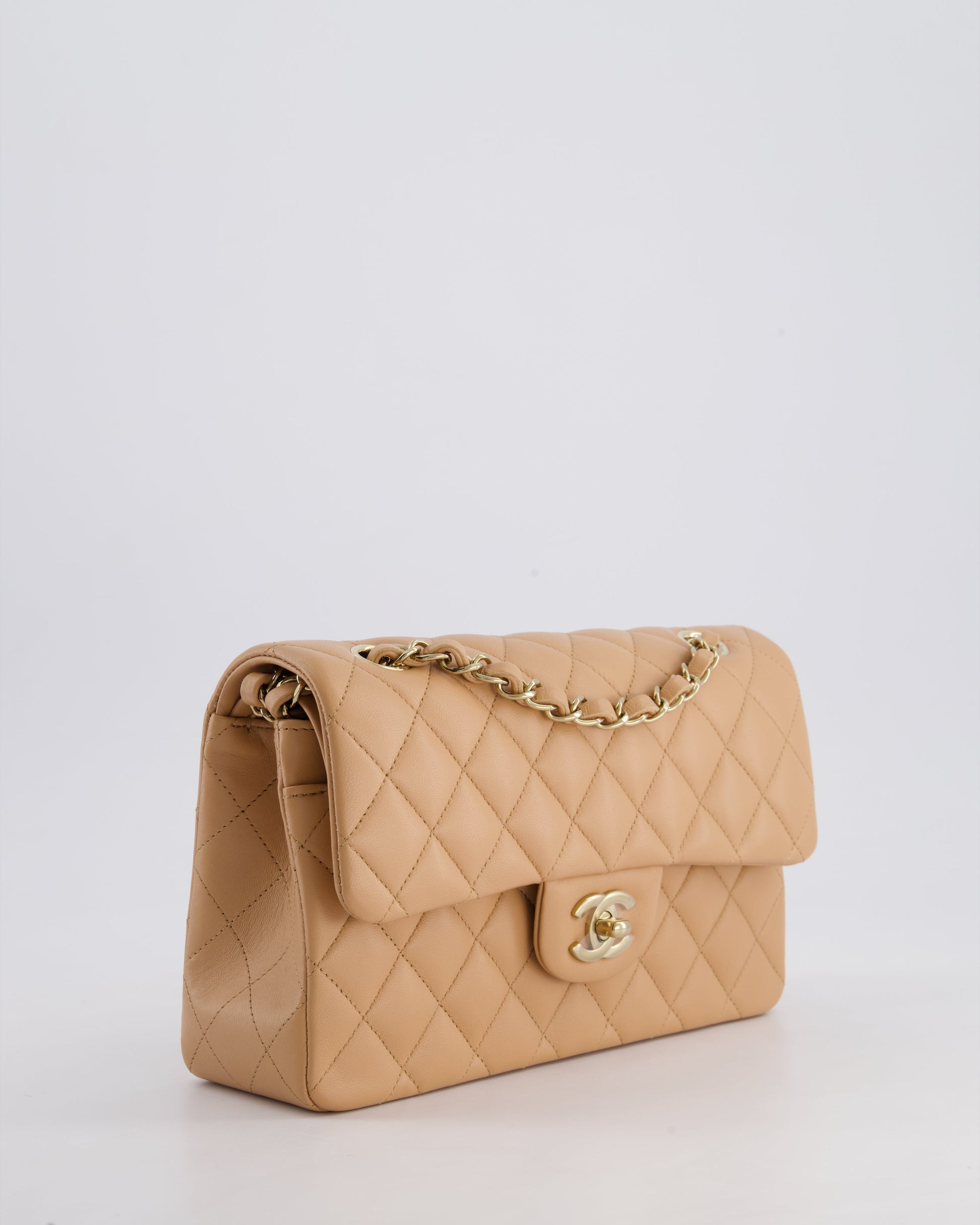 Chanel Beige Small Classic Double Flap Bag in Lambskin Leather with Champagne Gold Hardware