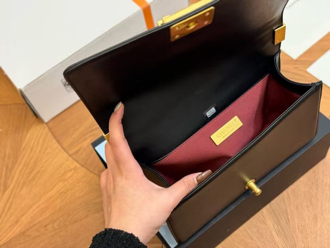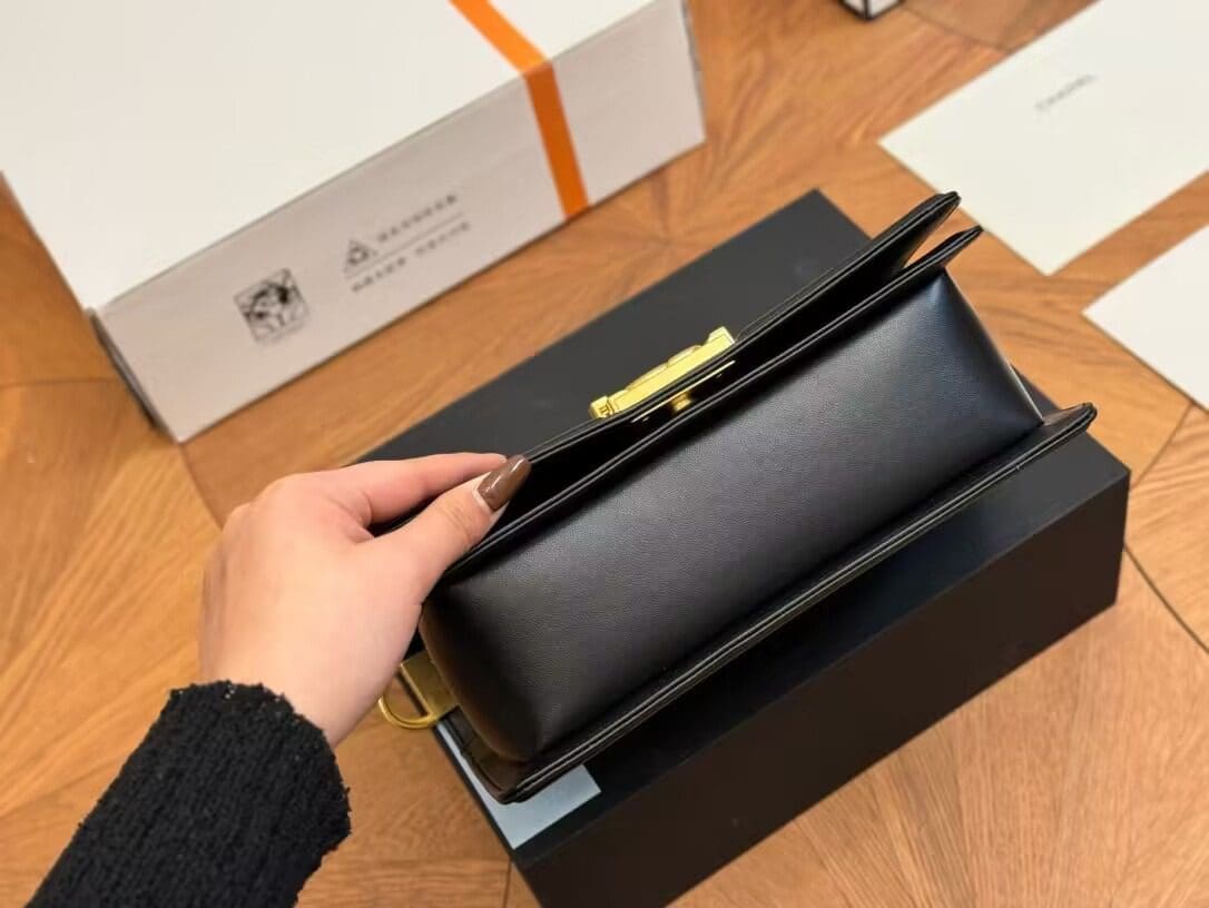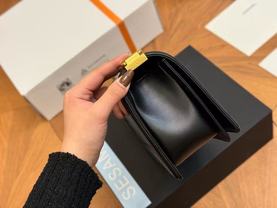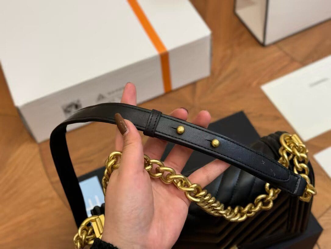 This is CHANEL Calfskin Chevron Quilted Medium Boy Flap in Black. This chic shoulder bag is crafted of chevron-quilted calfskin leather in black. It features a gold chain-link shoulder strap with a leather shoulder pad and a matching boy CC push lock on the front. This opens the bag to a black fabric interior with a patch pocket.