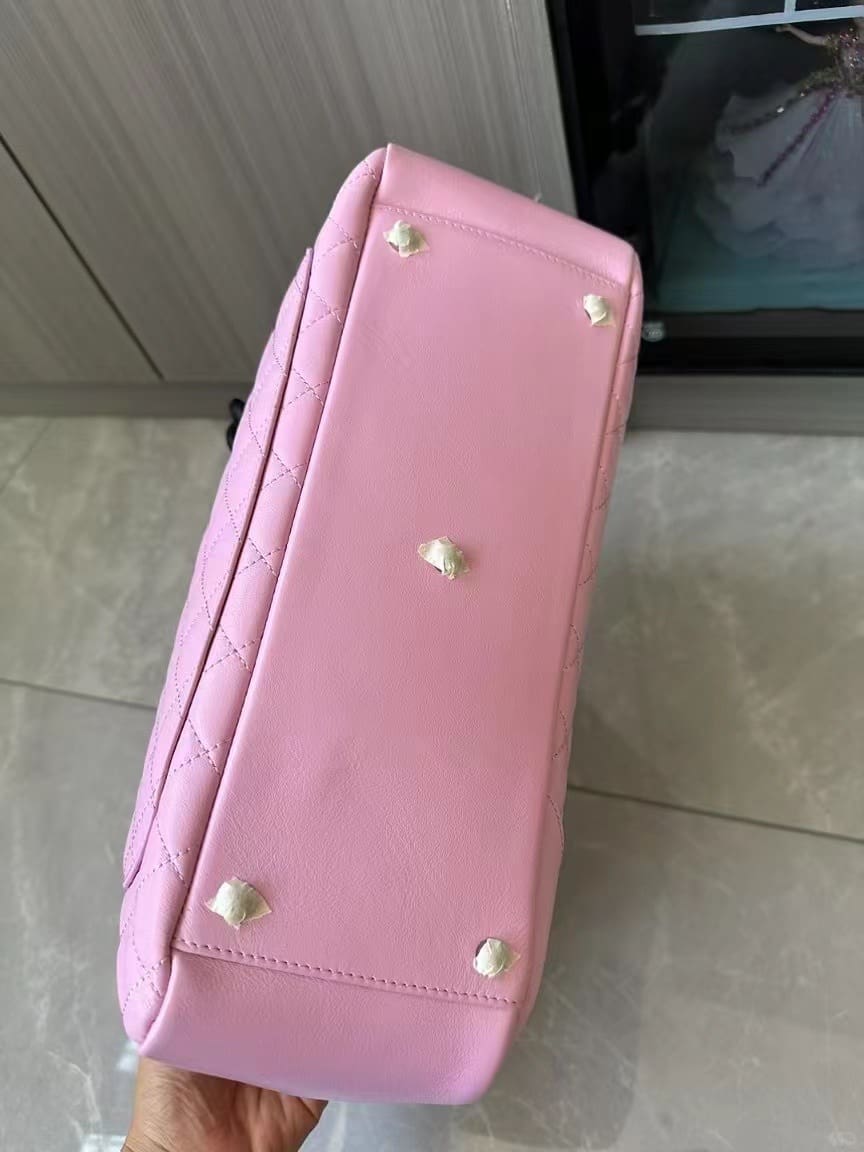 This is an replica CHANEL Calfskin Quilted Large Cambon Flap in Pink and Black. This stylish shoulder bag is crafted of diamond quilted calfskin leather. The bag features tall rolled leather top handles that are knotted at the ends with an off-set Chanel CC logo patch and a cross over flap with a silver Chanel CC Mademoiselle turn lock. This opens to a jacquard fabric interior. This is an excellent shoulder bag, ideal for day and evening wear, from Chanel!