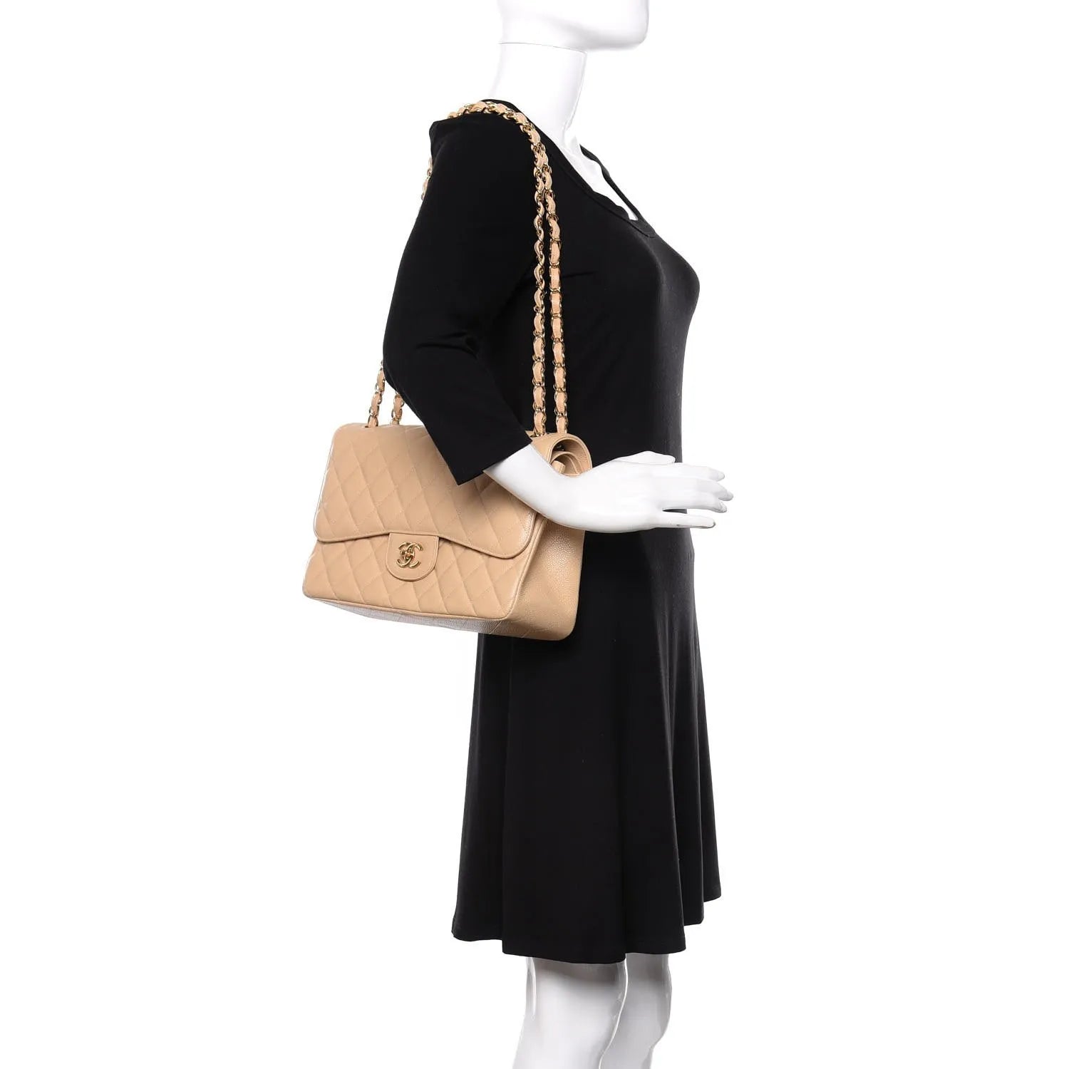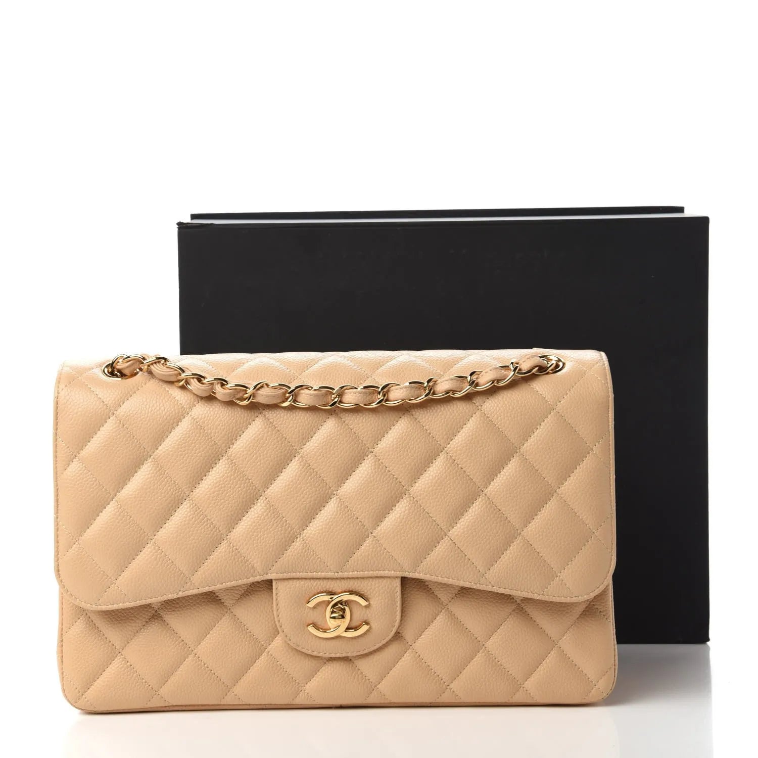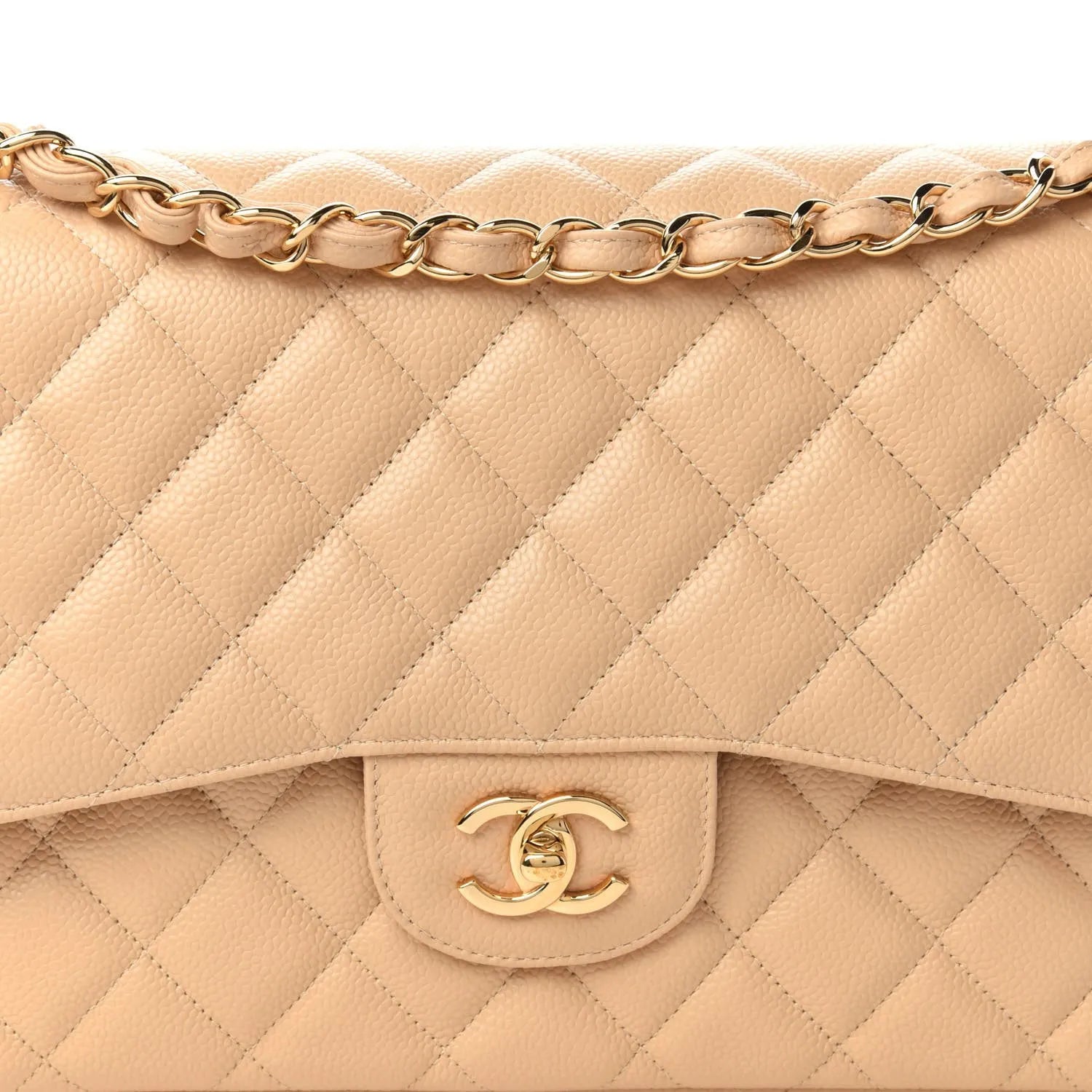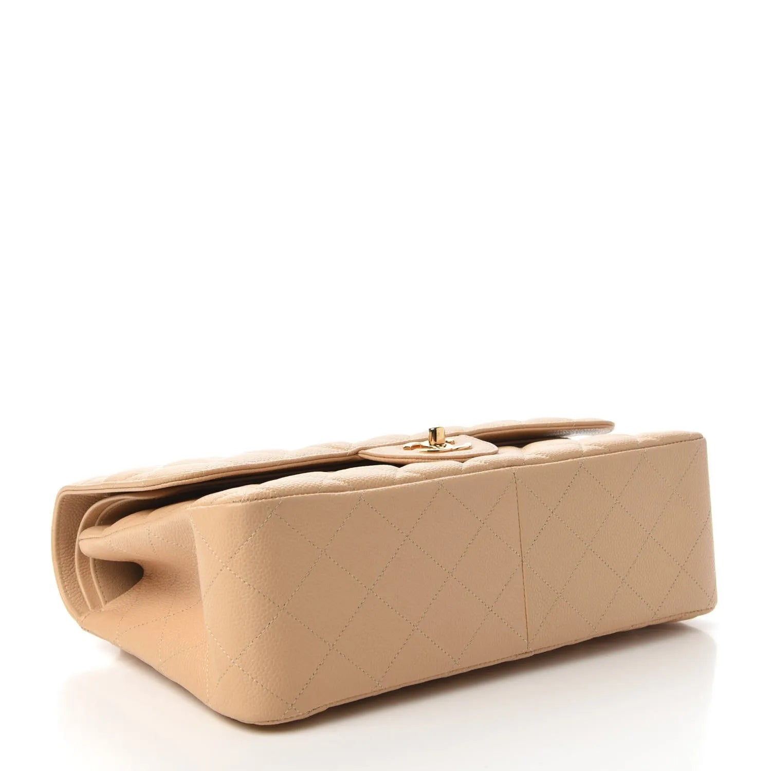This is an authentic CHANEL Caviar Quilted Jumbo Double Flap in Light Beige. This stylish shoulder bag is crafted of luxurious diamond quilted caviar leather in light beige. This bag features a leather threaded chain-link shoulder strap with polished gold hardware. The Chanel CC turn-lock opens to an inner flap and matching leather interior with patch pockets.