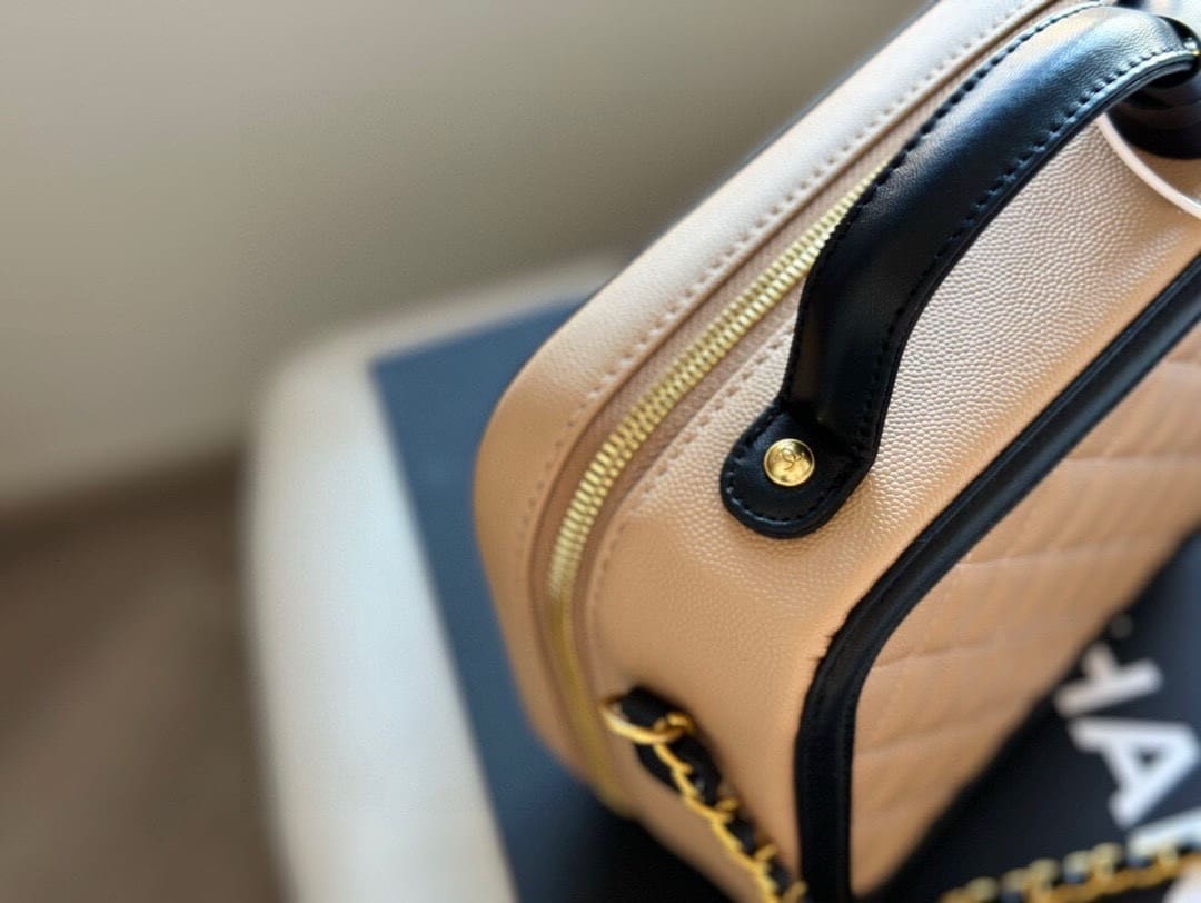 This is an replica CHANEL Caviar Quilted Medium CC Filigree Vanity Case in Beige and Black. This chic stylish Chanel bag is crafted of luxurious diamond quilted caviar leather in beige and the handle, border, and classic Chanel CC in black leather. The elegant shoulder bag features the signature aged gold and threaded leather chain with a black shoulder pad. The two zippers open three-quarters of the way around to a leather interior in black, with a zipper pocket and central zipper compartment.