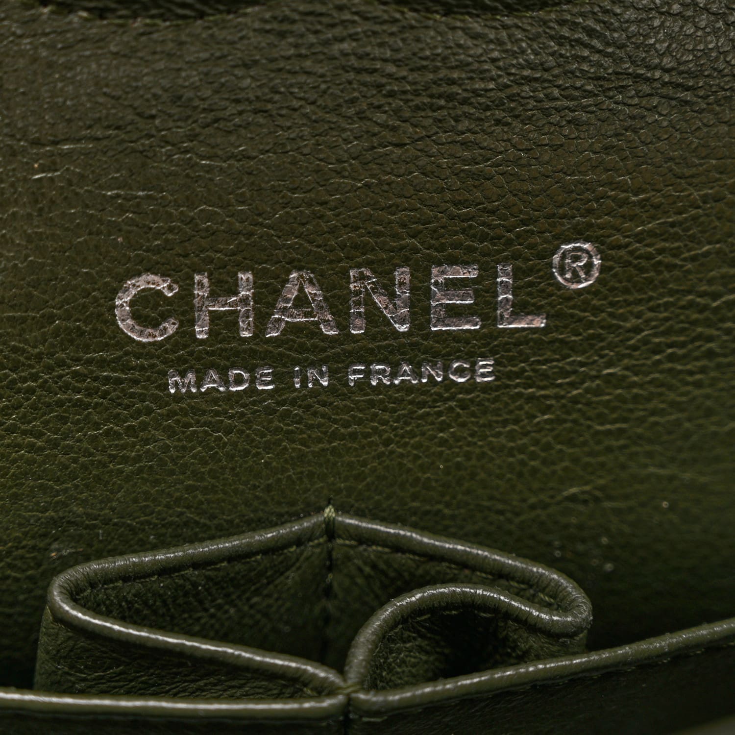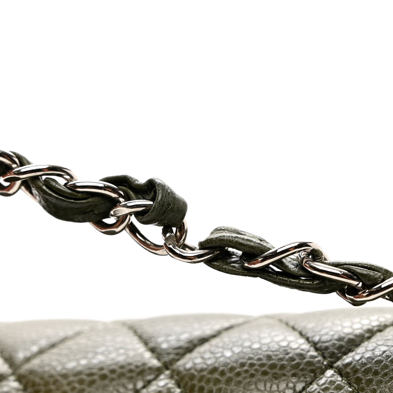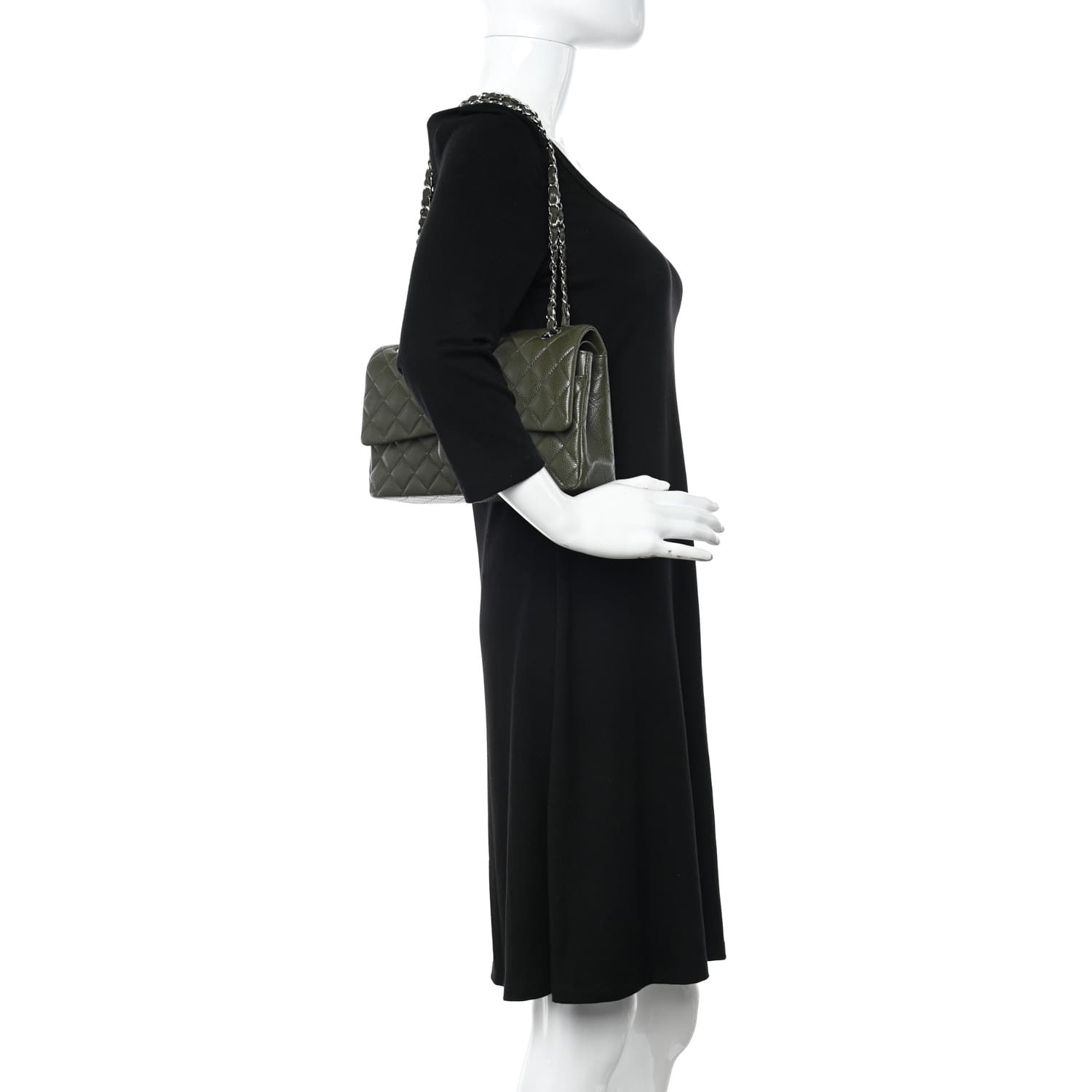 This is an replica CHANEL Caviar Quilted Medium Double Flap in Dark Green. This stunning shoulder bag is crafted of luxurious diamond quilted caviar leather in a beautiful shade of green. The bag features a rear patch pocket, a polished silver chain-link leather-threaded shoulder strap and a front flap with a silver Chanel CC turn-lock closure. The bag opens to reveal an inner flap with matching leather interior and has patch pockets and a front pocket.
